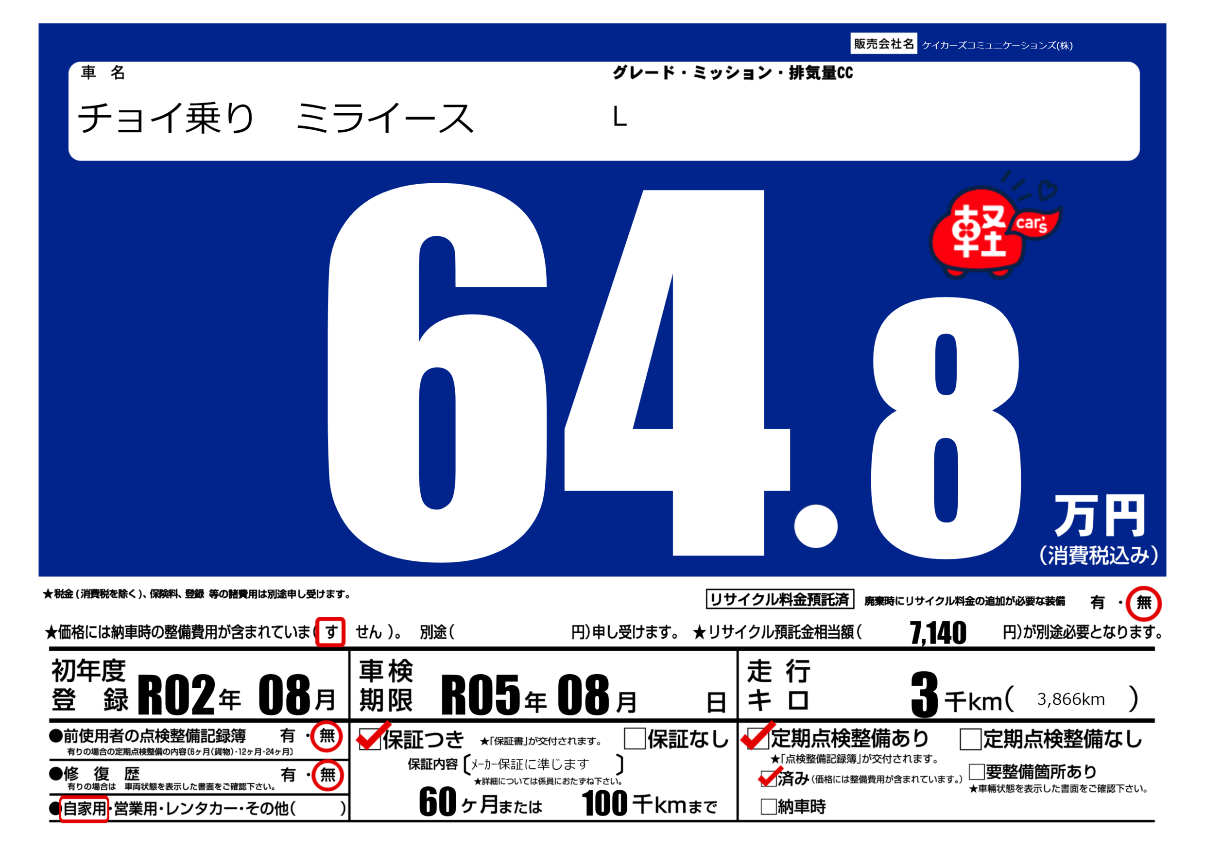 | 定期点検整備 | 定期点検整備あり 定期点検整備済み | ||