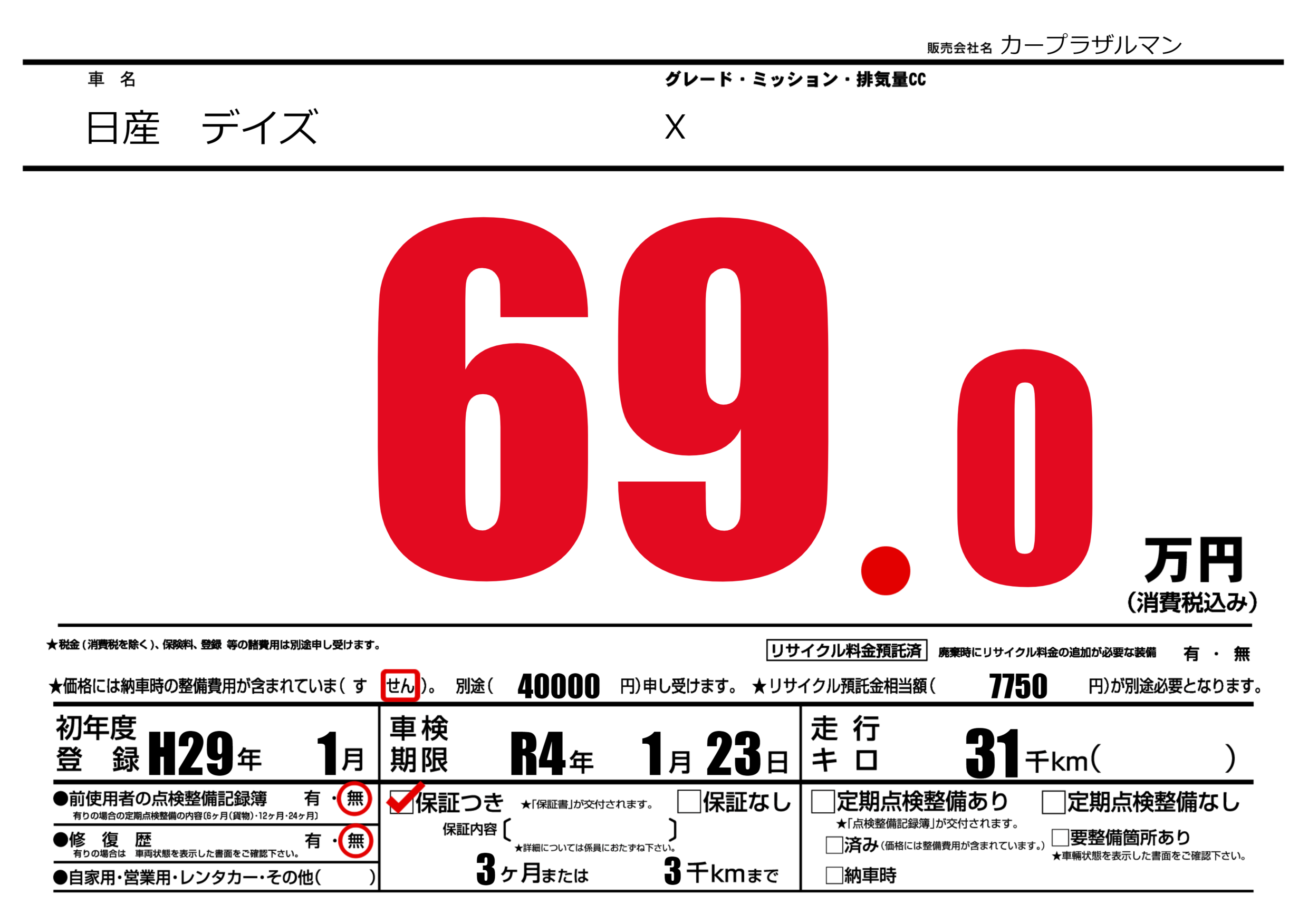 | 車名 | 日産 デイズ | グレード ミッション 排気量 |