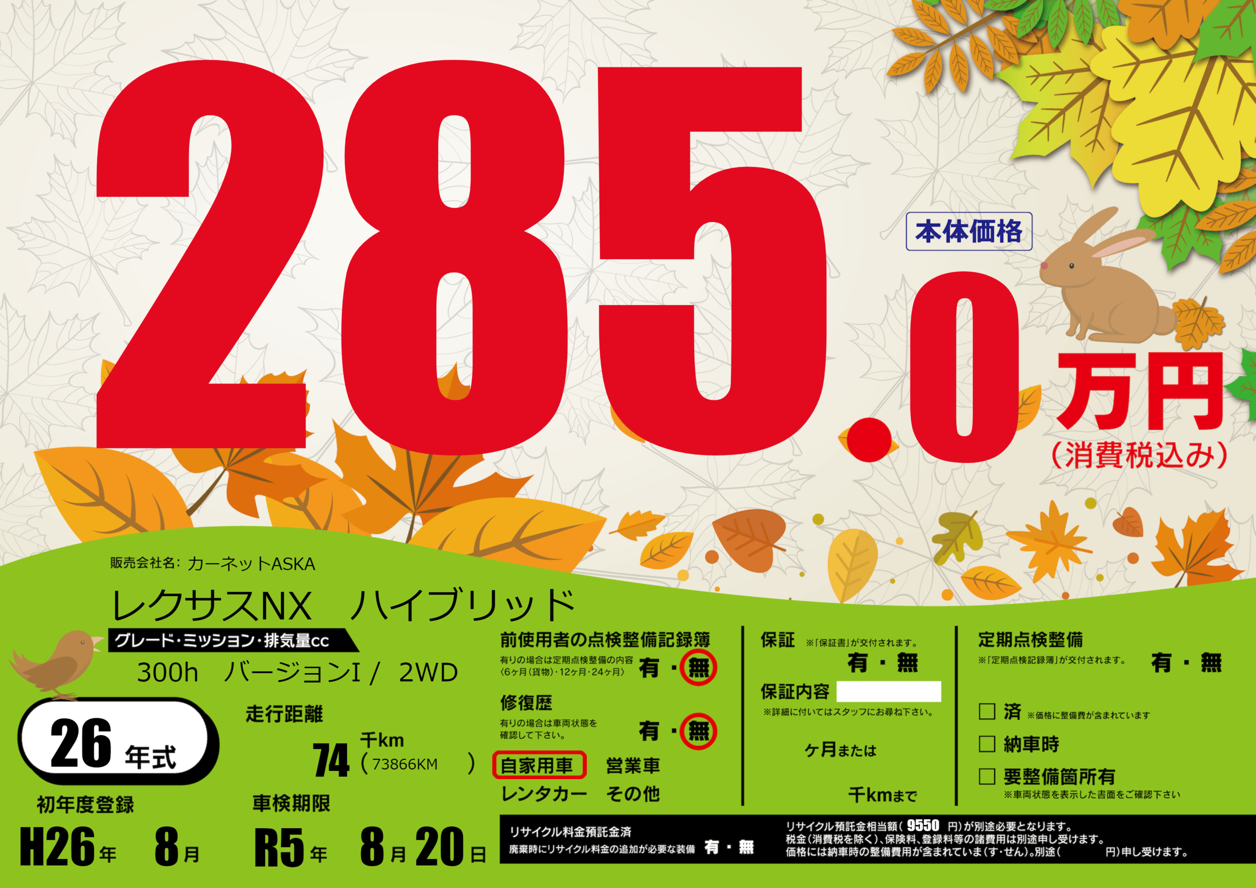 | 車名 | レクサスNX ハイブリッド | グレード ミッション 排気量 |