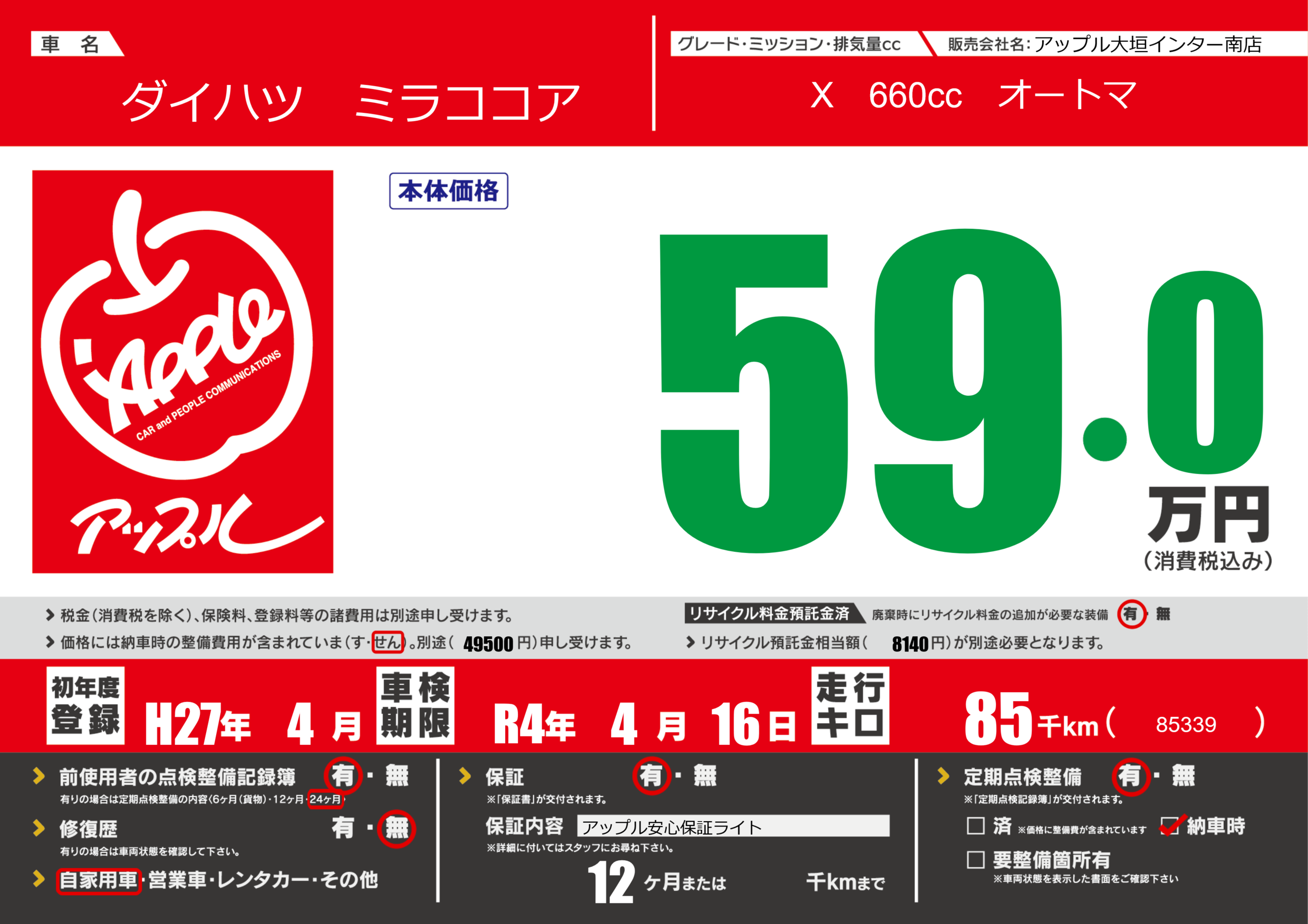 保証付き 保証内容(アップル安心保証ライト) 12ヶ月または()千kmまで |