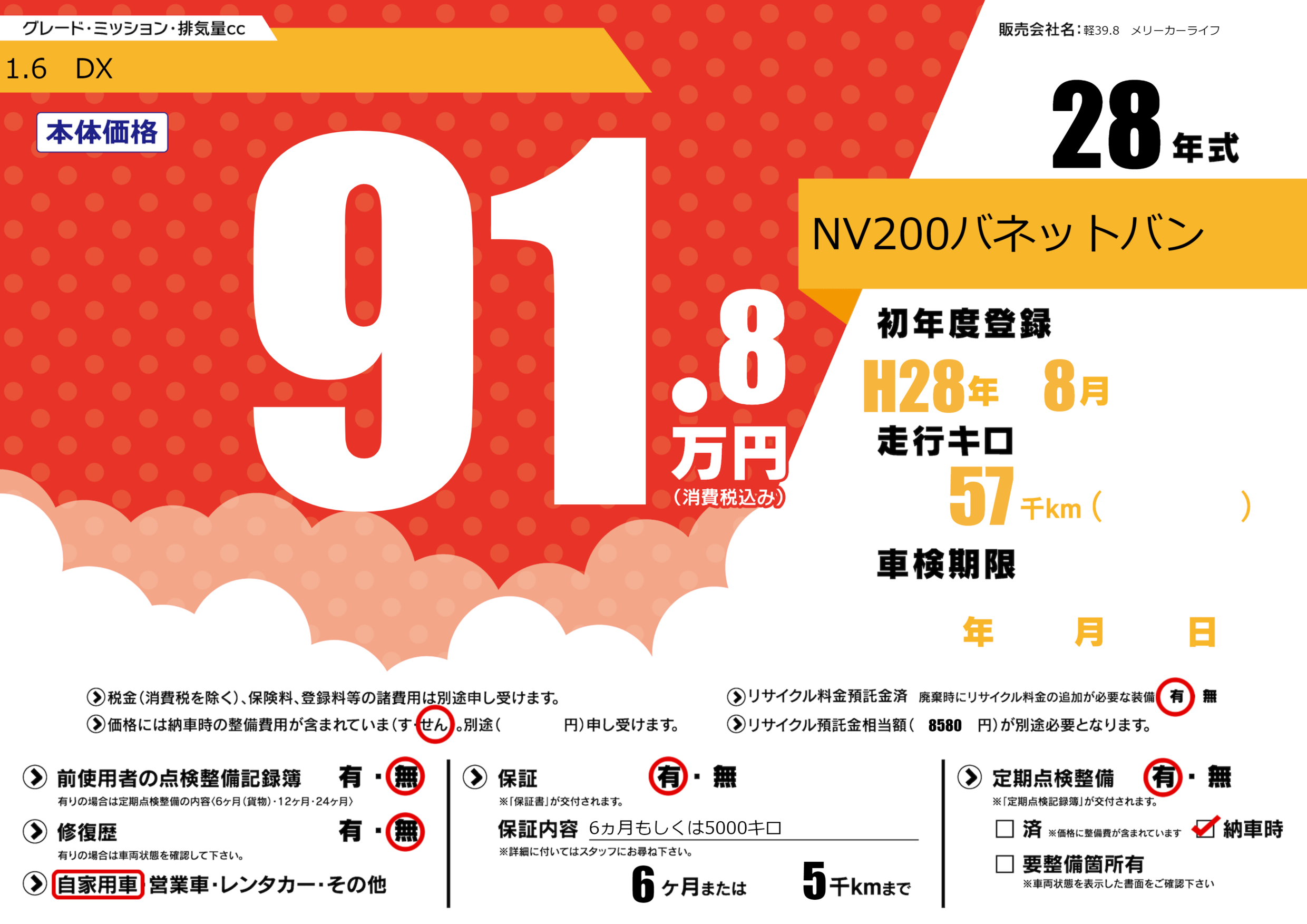 保証付き 保証内容(6ヵ月もしくは5000キロ) 6ヶ月または(5)千kmまで |