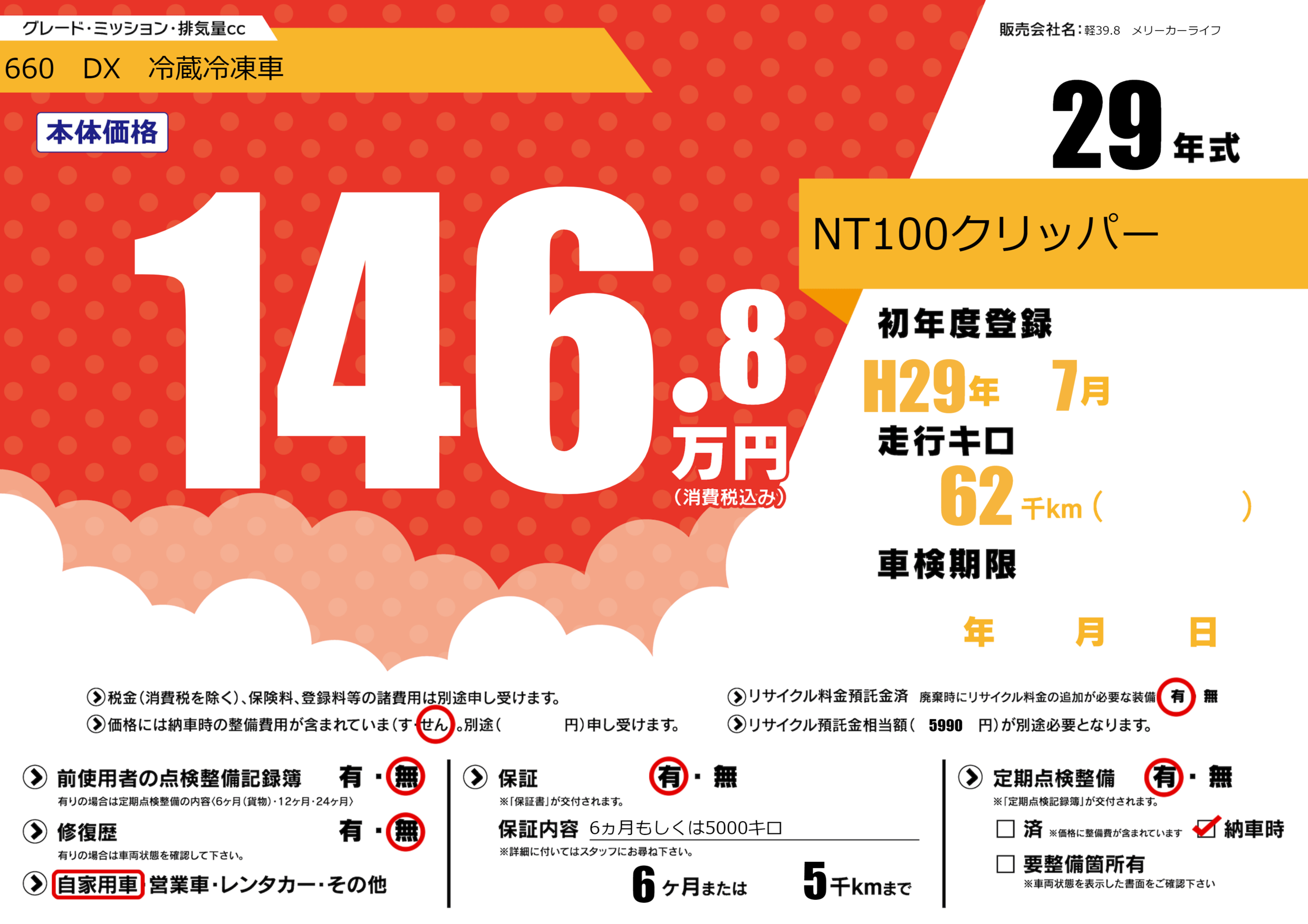 | 定期点検整備 | 定期点検整備あり 納車時あり | ||