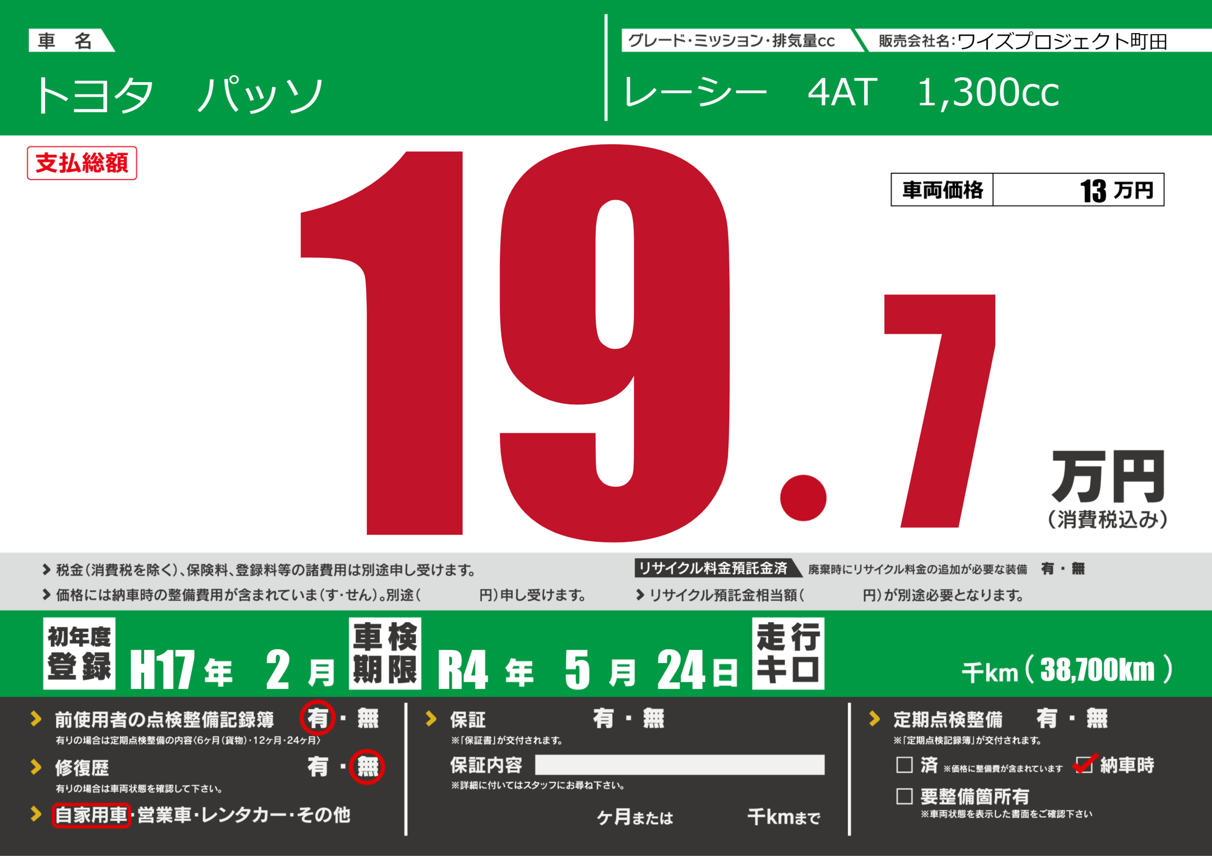 | 車名 | トヨタ パッソ | グレード ミッション 排気量 |