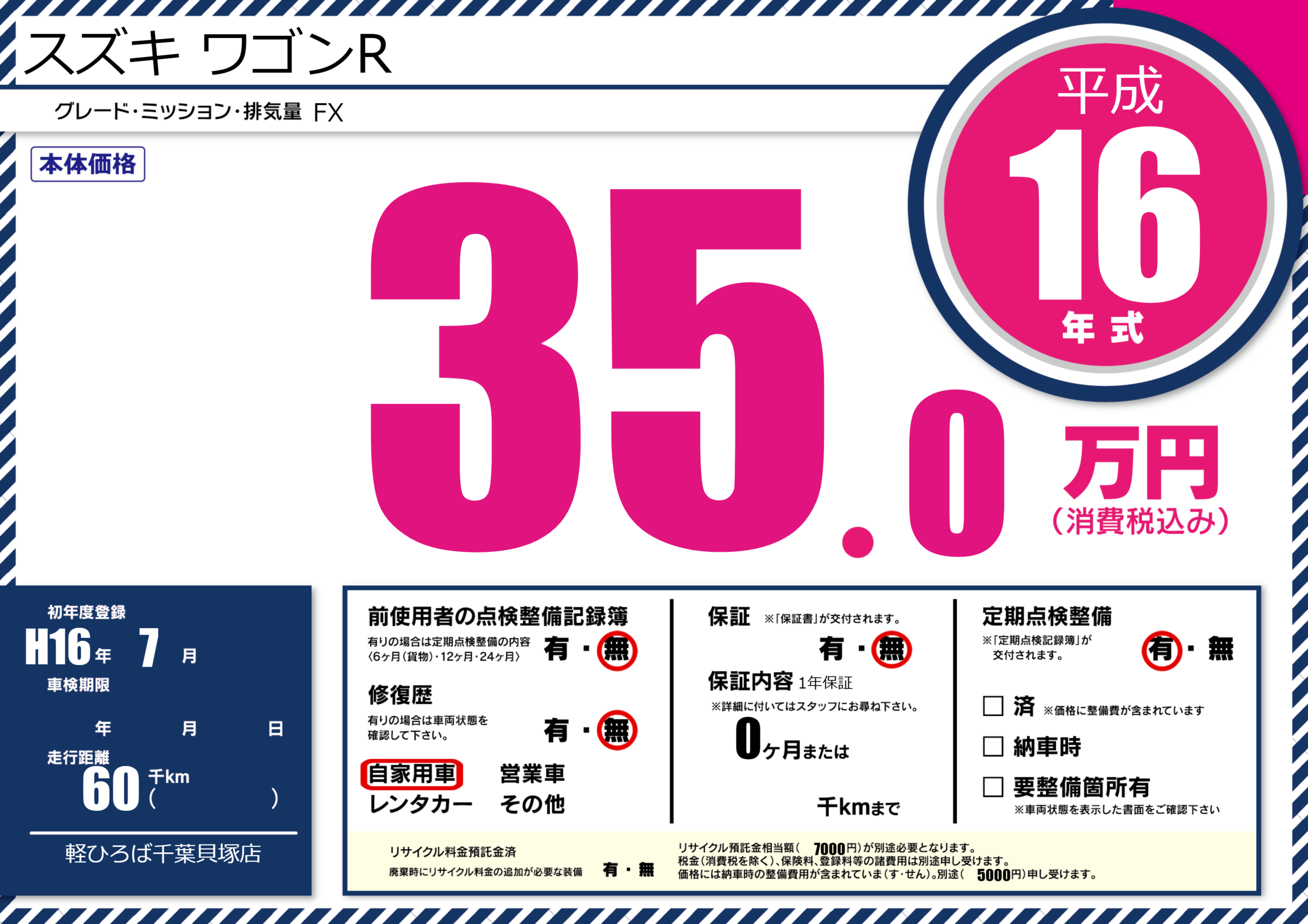 | 走行キロ | 6万km | 初年度登録 | H16年7月 |