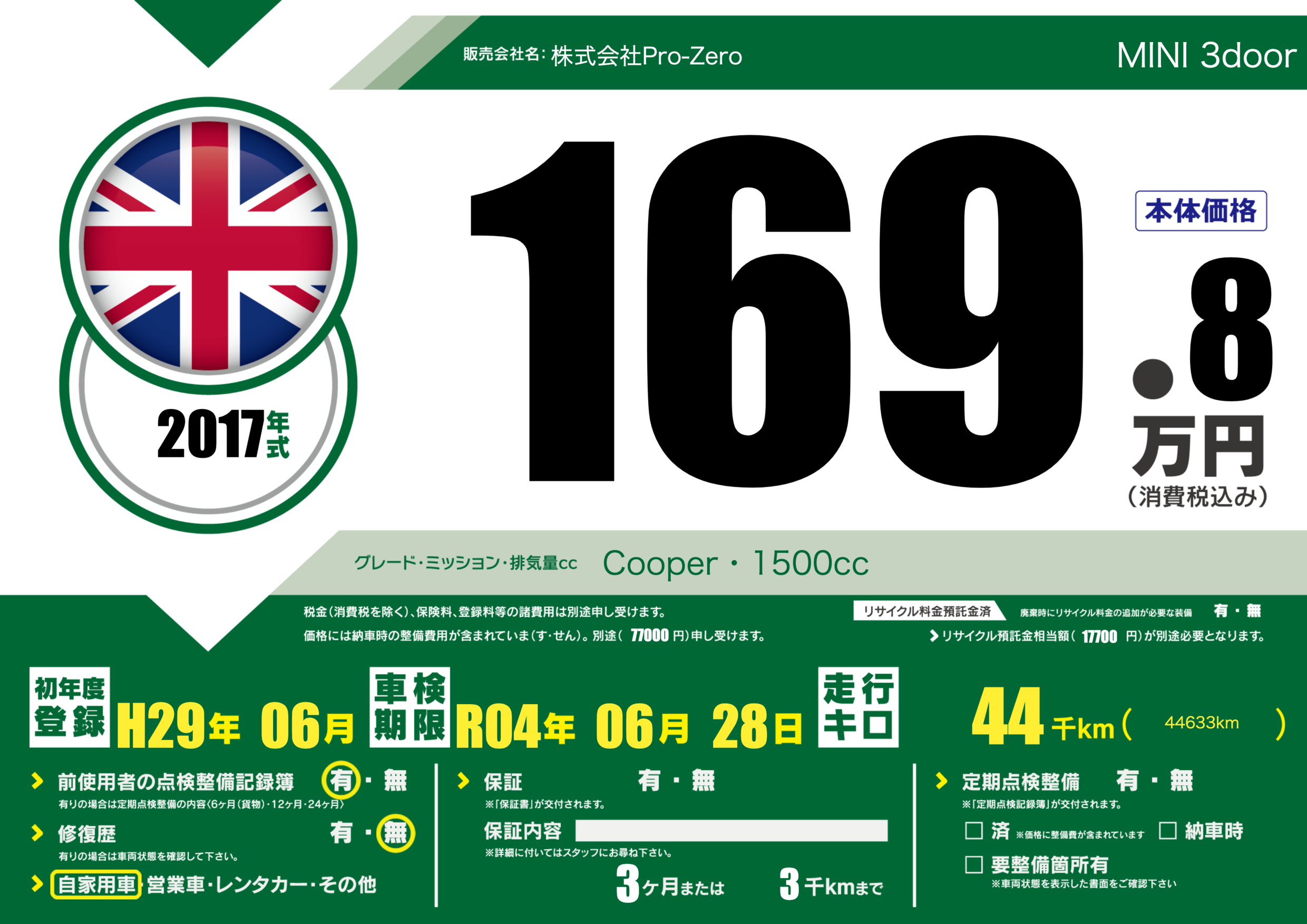 | 車名 | MINI 3door | グレード ミッション 排気量 |