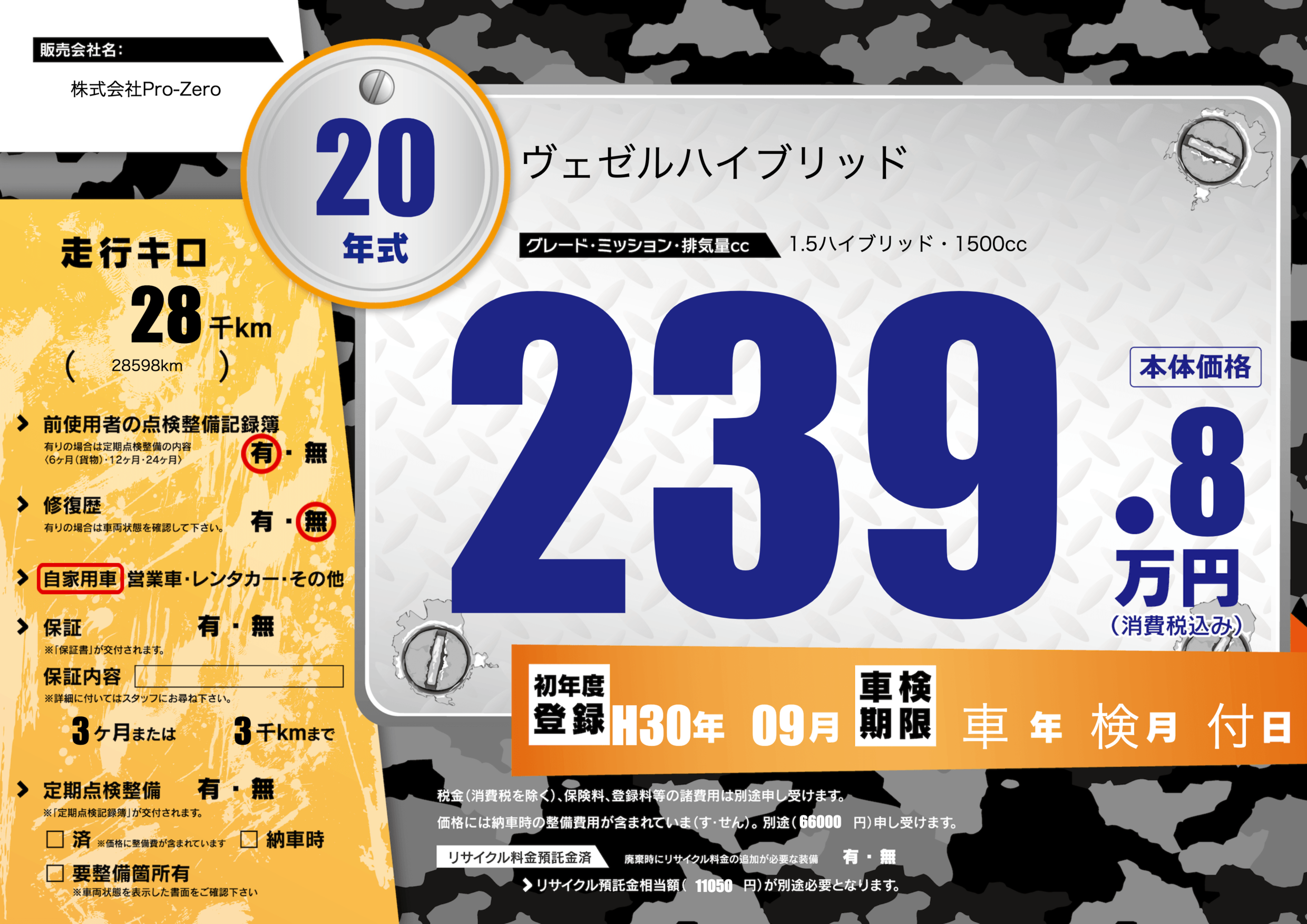 | 車名 | ヴェゼルハイブリッド | グレード ミッション 排気量 |