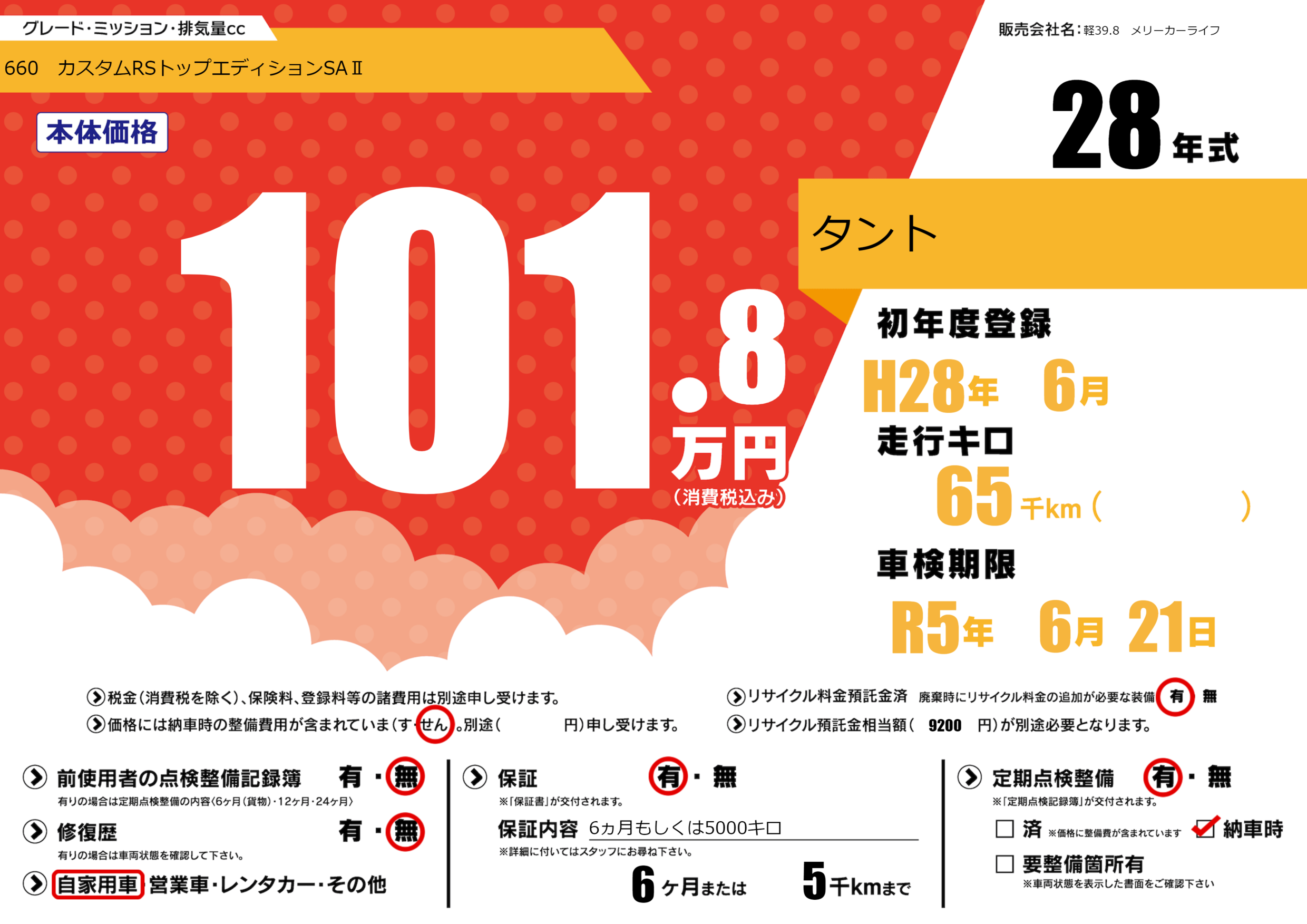 | 定期点検整備 | 定期点検整備あり 納車時あり | ||