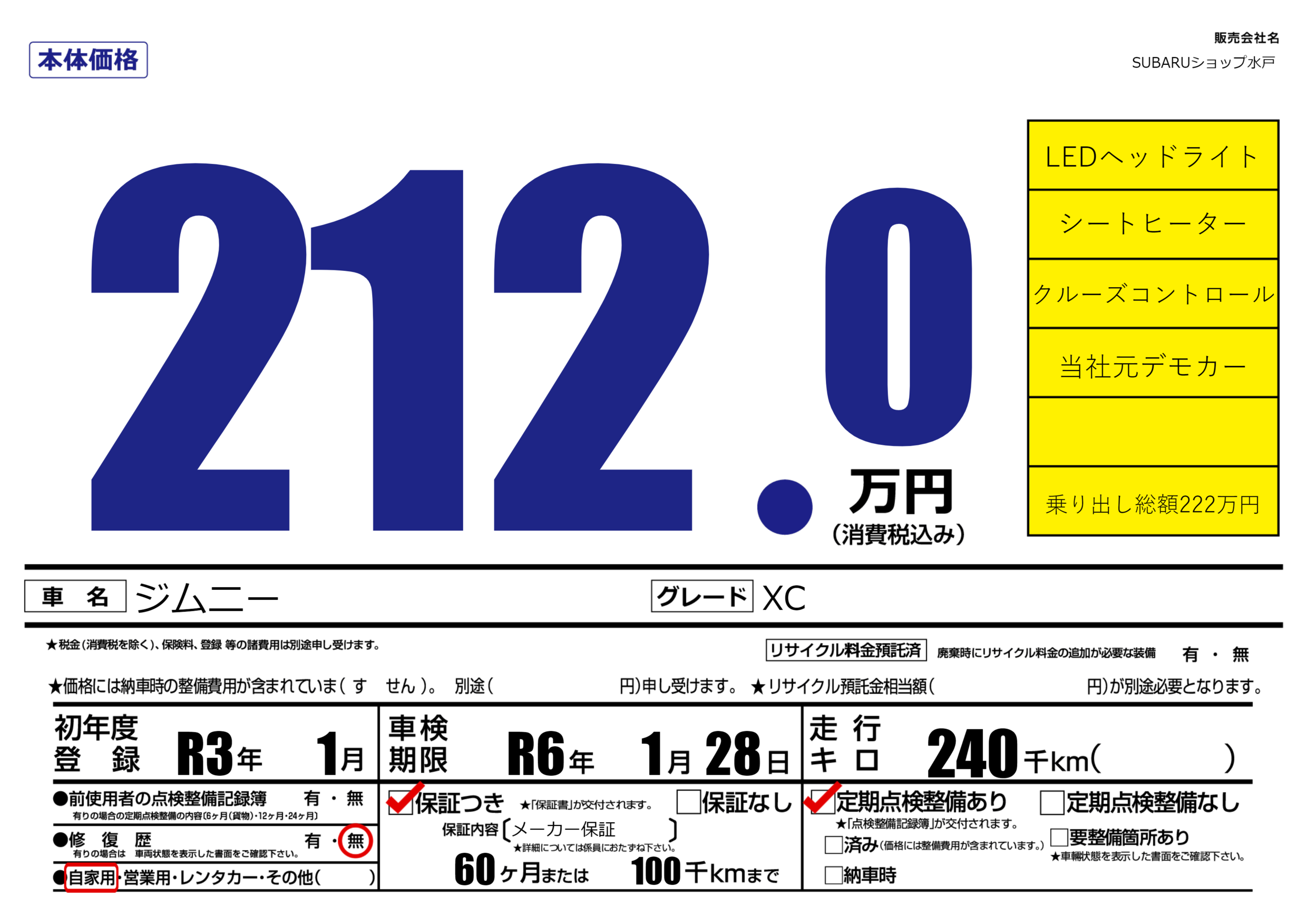 | 車名 | ジムニー | グレード ミッション 排気量 |