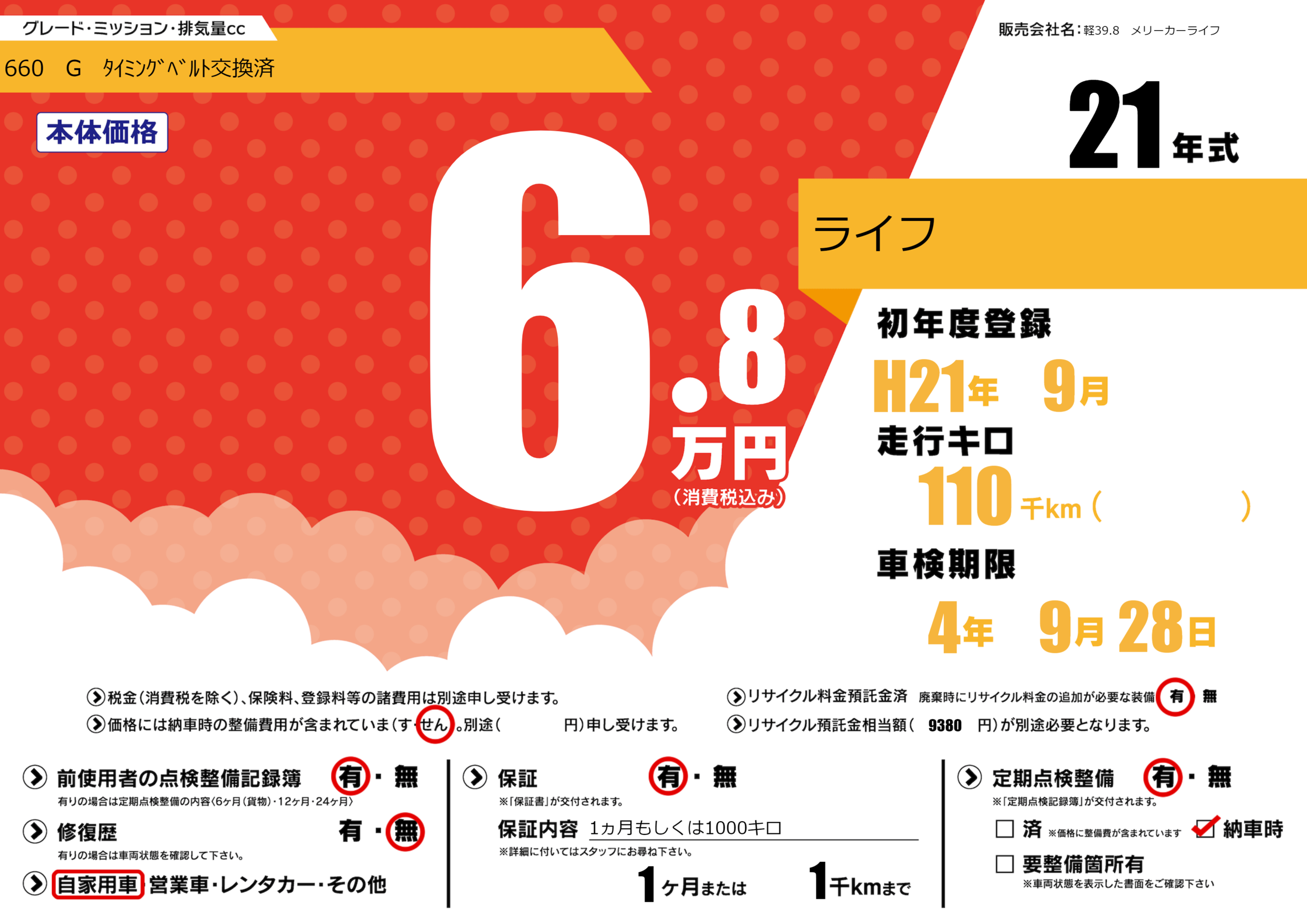 | 車名 | ライフ | グレード ミッション 排気量 |