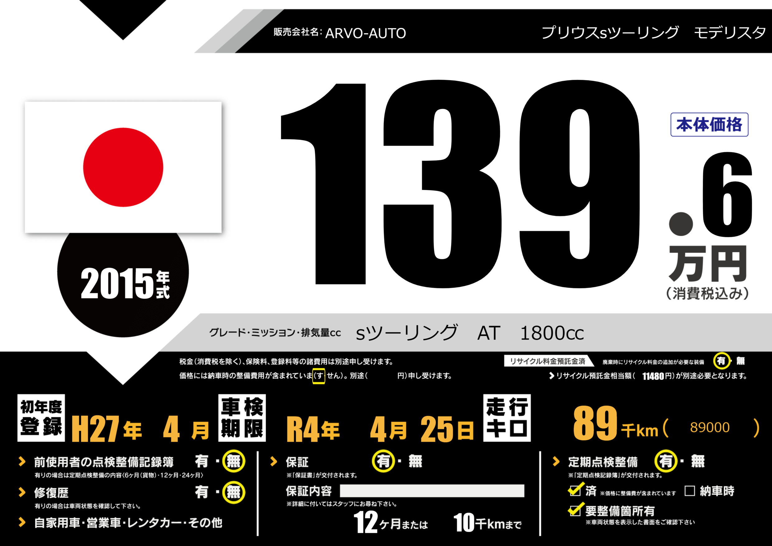 | 車名 | プリウスsツーリング モデリスタ | グレード ミッション 排気量 |