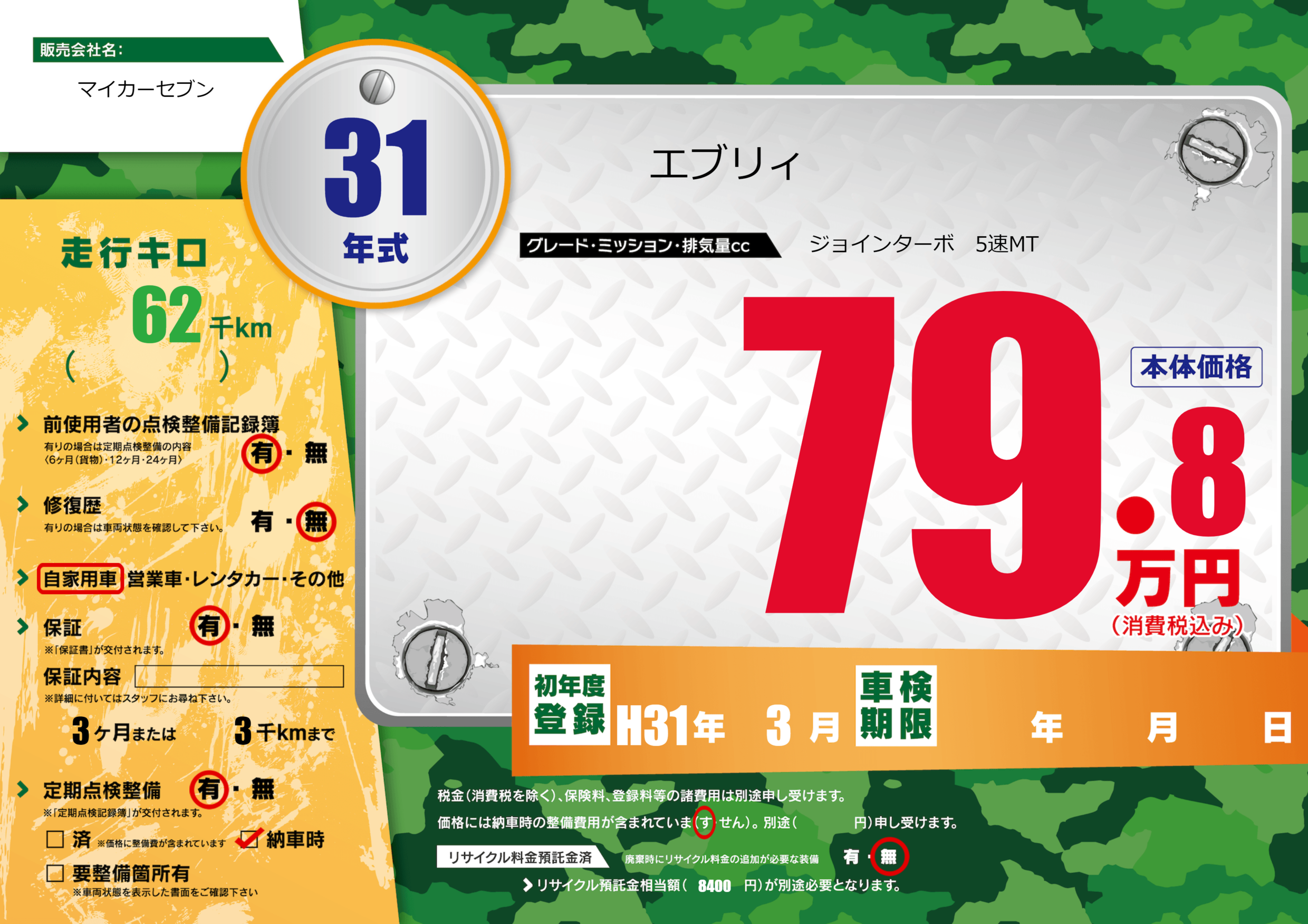 | 車名 | エブリィ | グレード ミッション 排気量 |