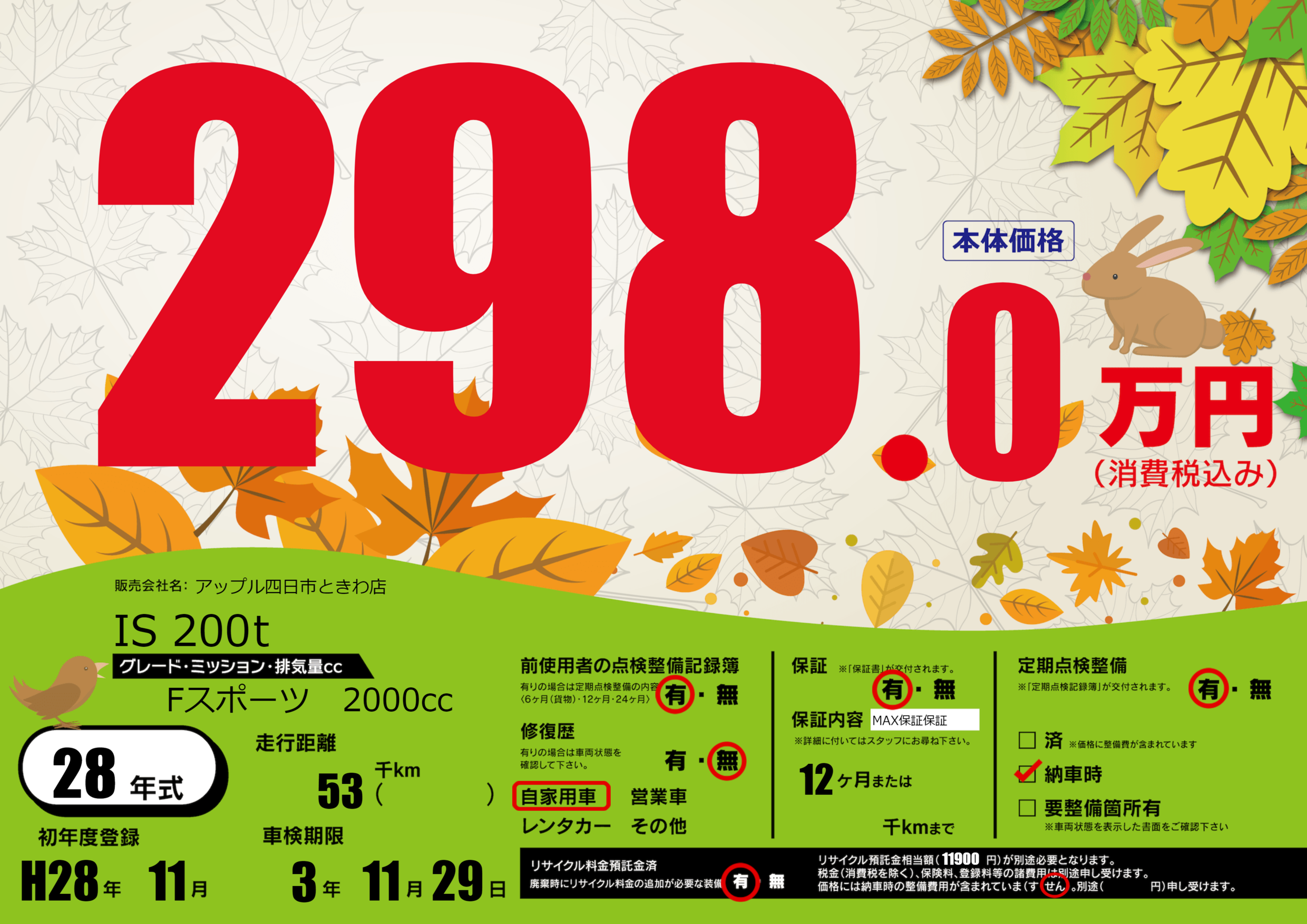 | 車名 | IS 200t | グレード ミッション 排気量 |