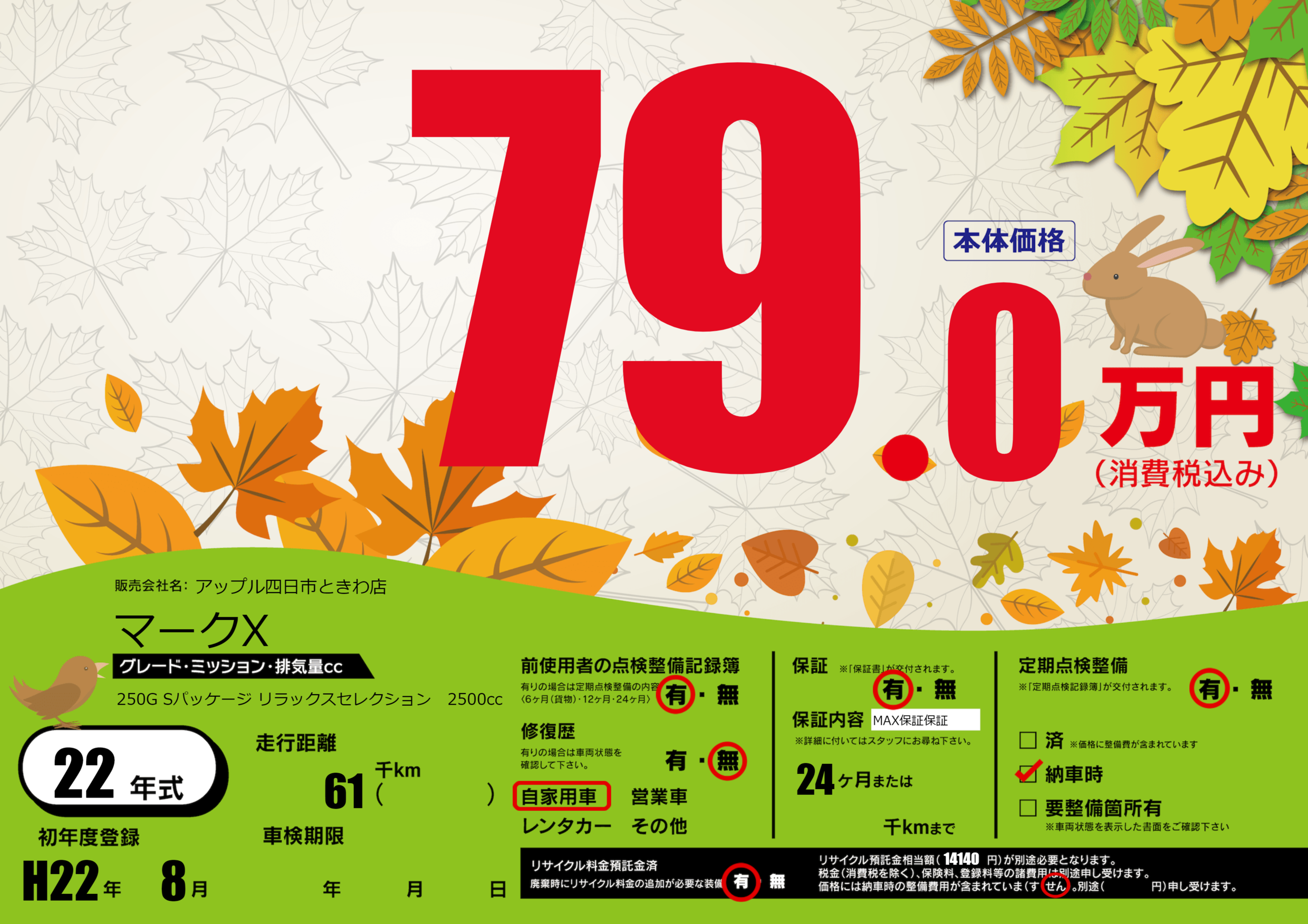 | 走行キロ | 6.1万km | 初年度登録 | H22年8月 |
