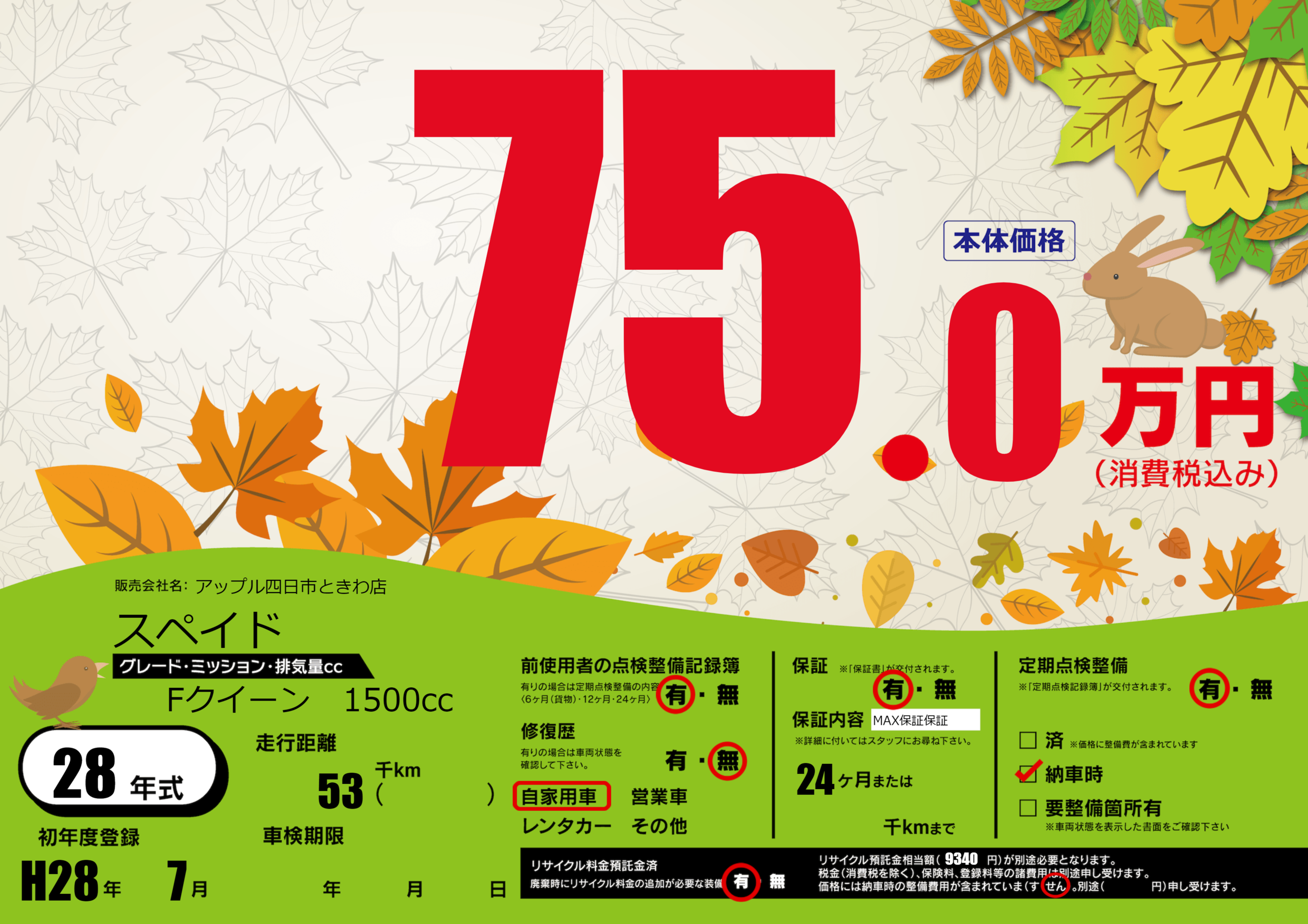 | 定期点検整備 | 定期点検整備あり 納車時あり | ||