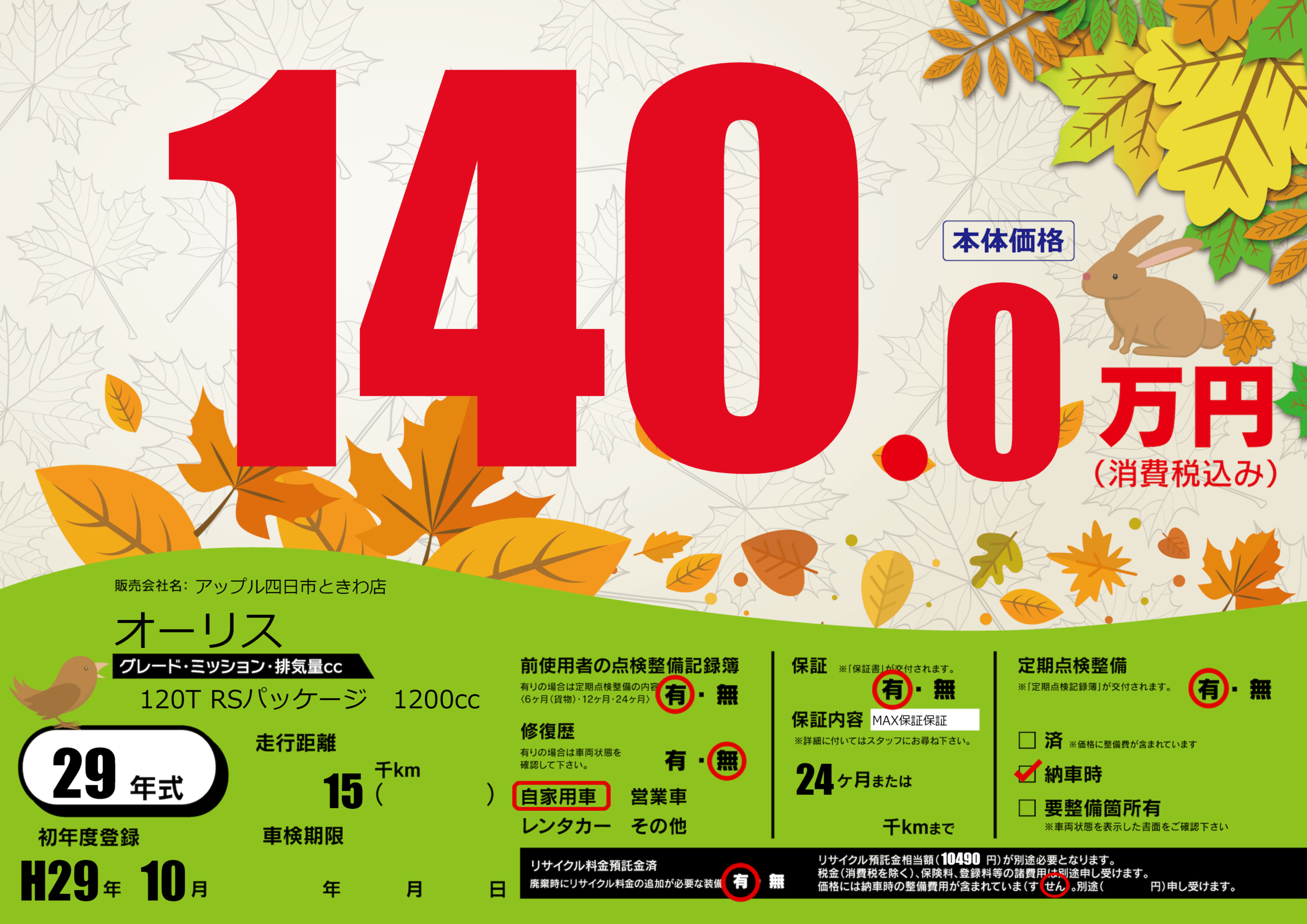 | 定期点検整備 | 定期点検整備あり 納車時あり | ||