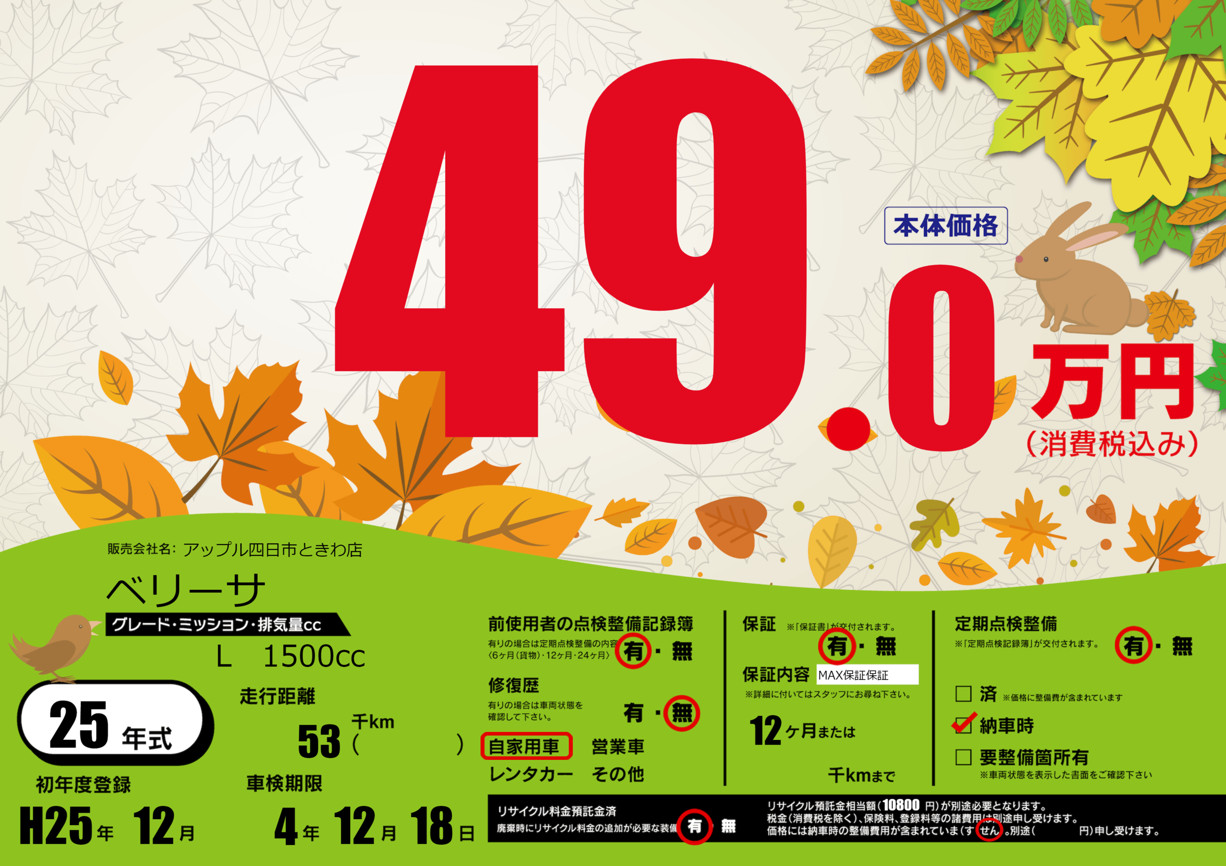 | 定期点検整備 | 定期点検整備あり 納車時あり | ||