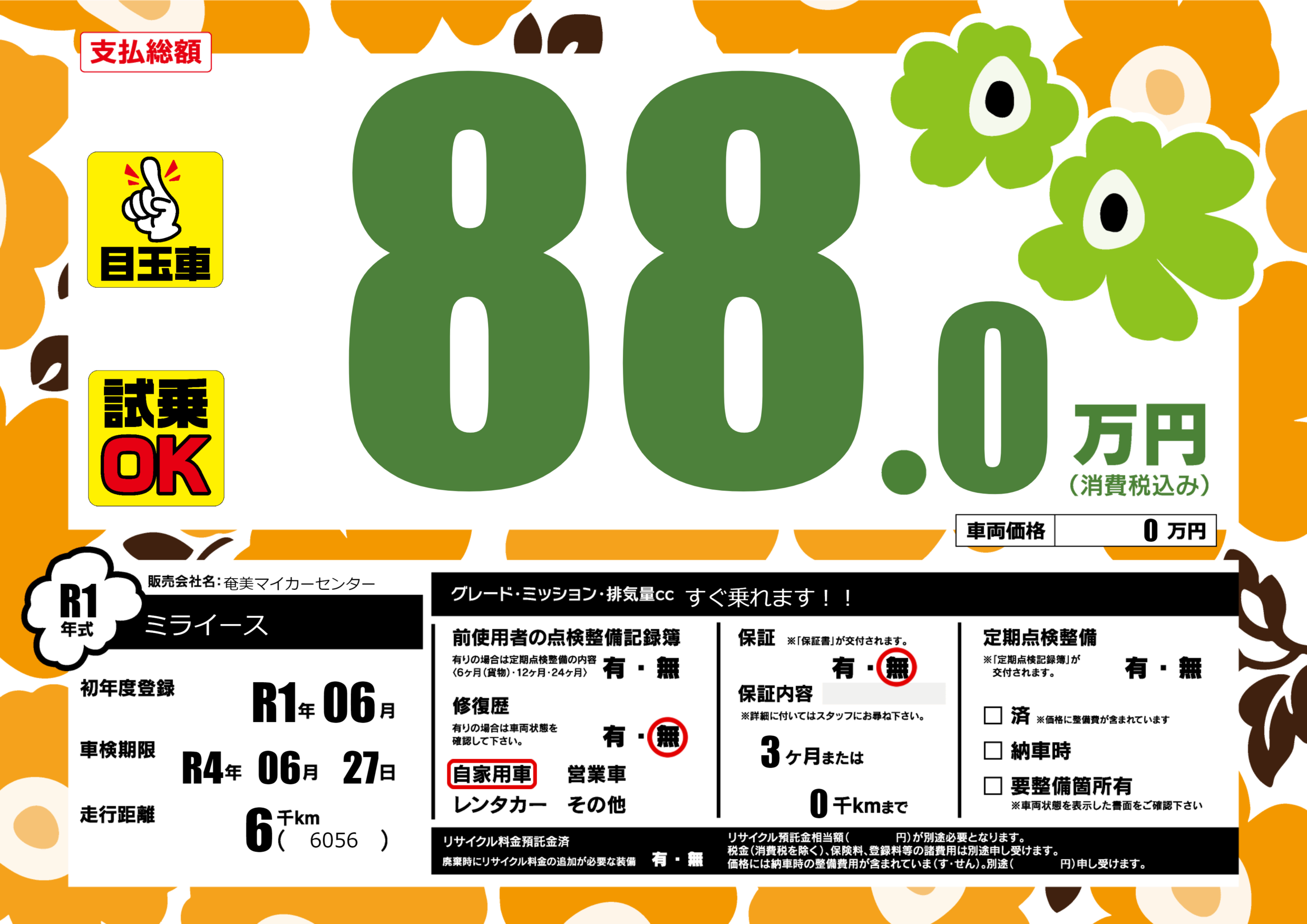 | 走行キロ | 0.6万km | 初年度登録 | R1年06月 |