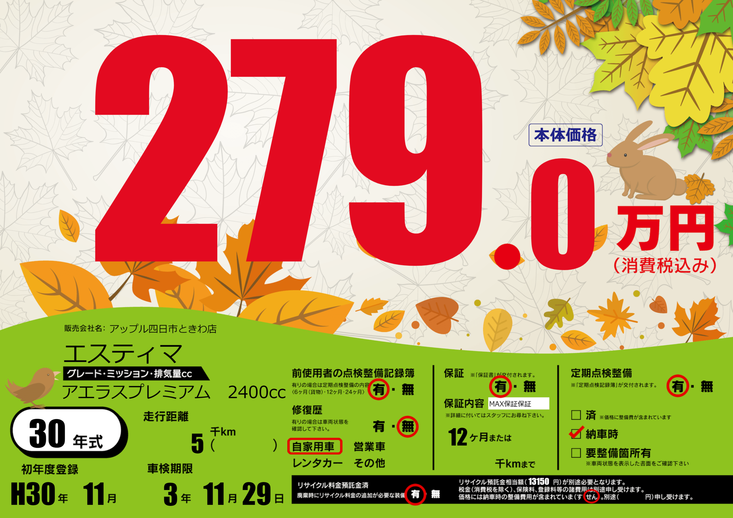 | 車名 | エスティマ | グレード ミッション 排気量 |