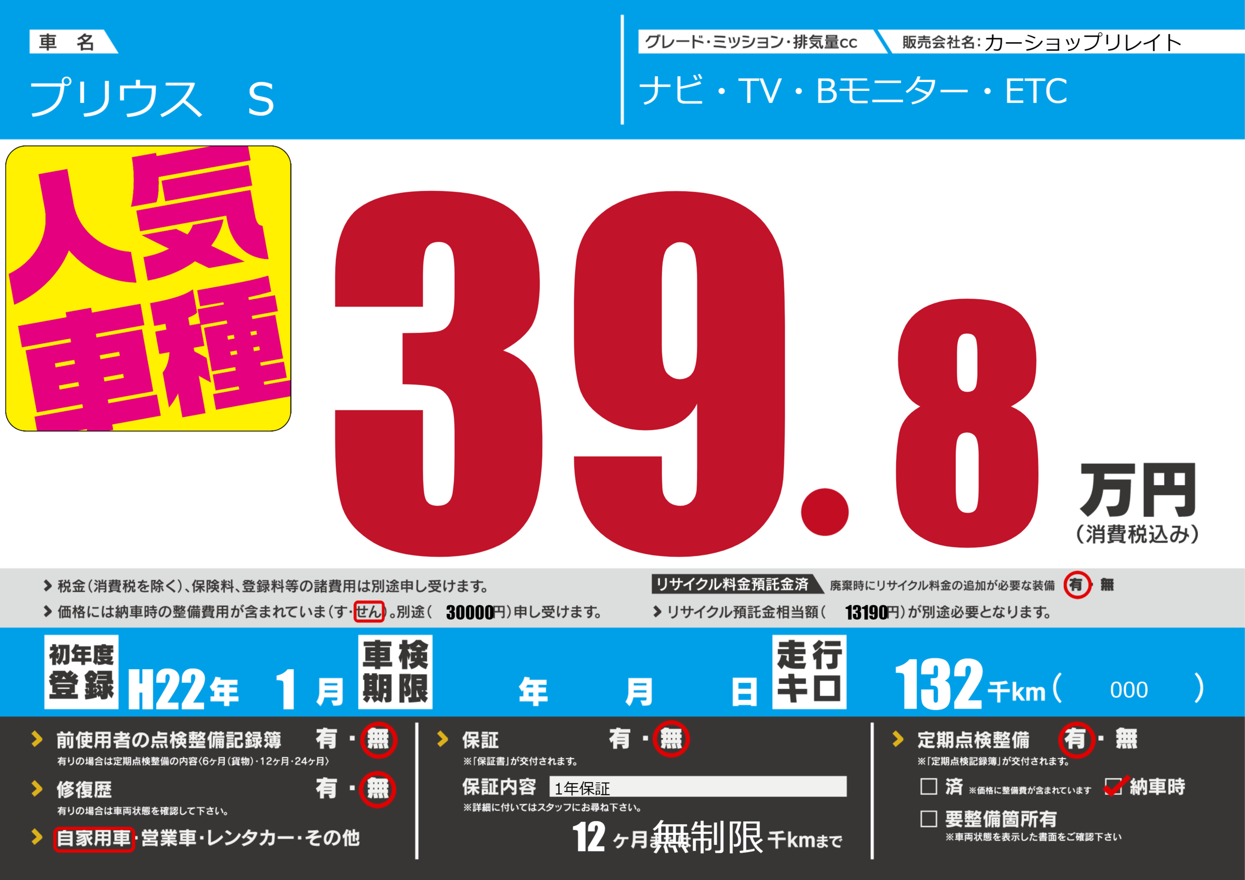 | 車名 | プリウス S | グレード ミッション 排気量 |