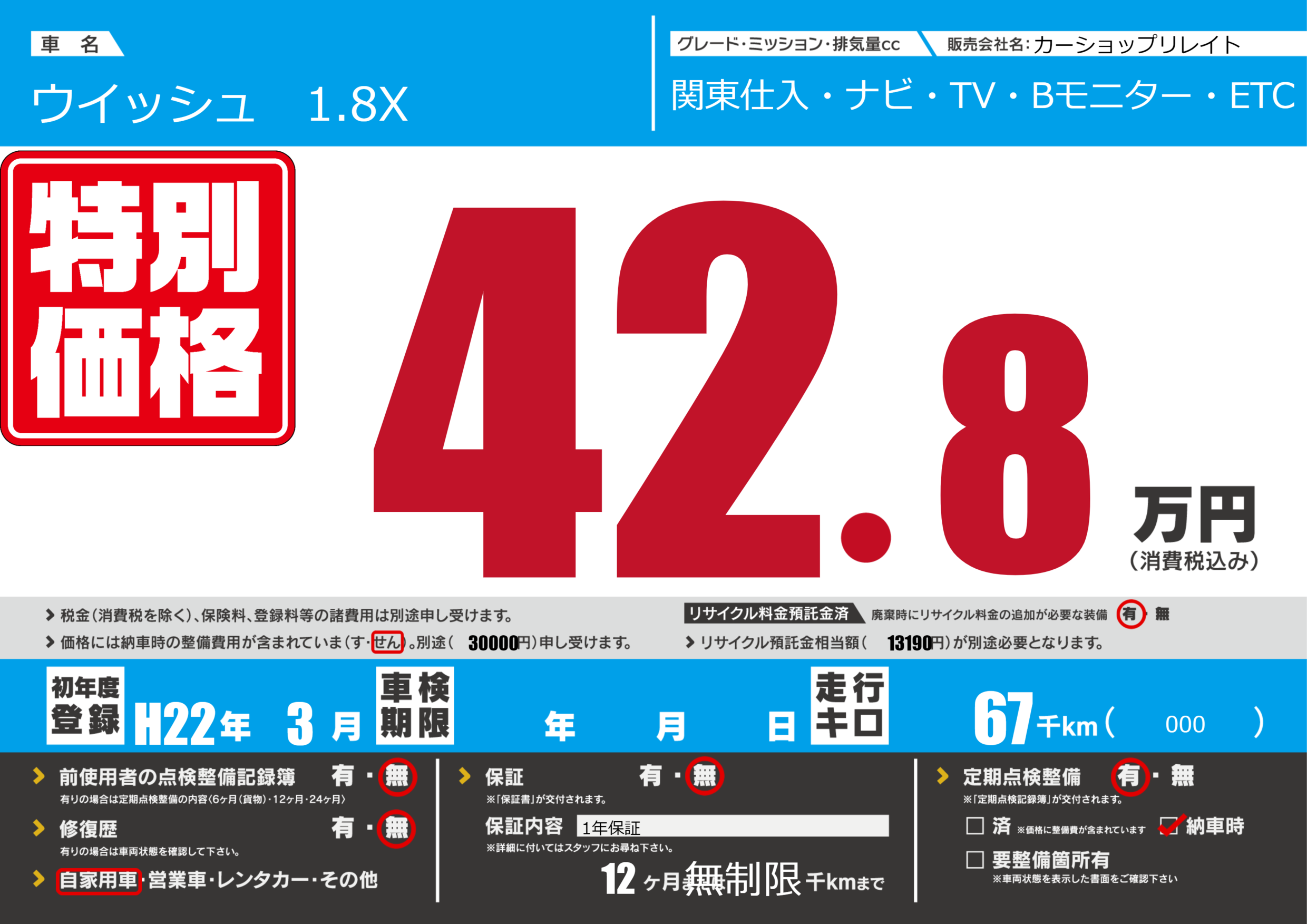 | 車名 | ウイッシュ 1.8X | グレード ミッション 排気量 |