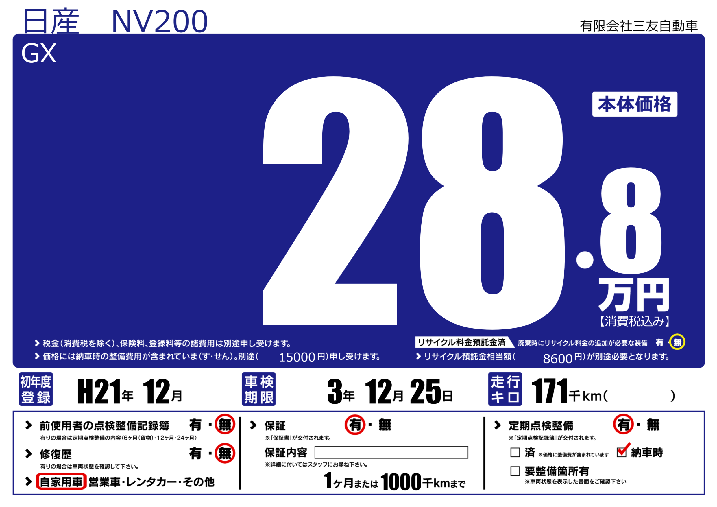 保証付き 保証内容(---) 1ヶ月または(1000)千kmまで |