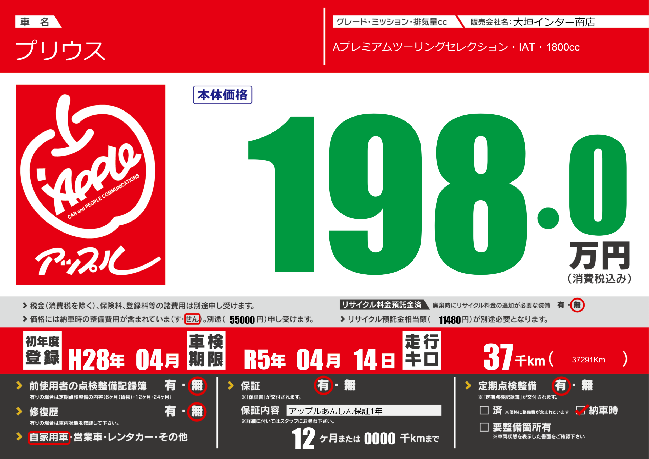 | 車名 | プリウス | グレード ミッション 排気量 |