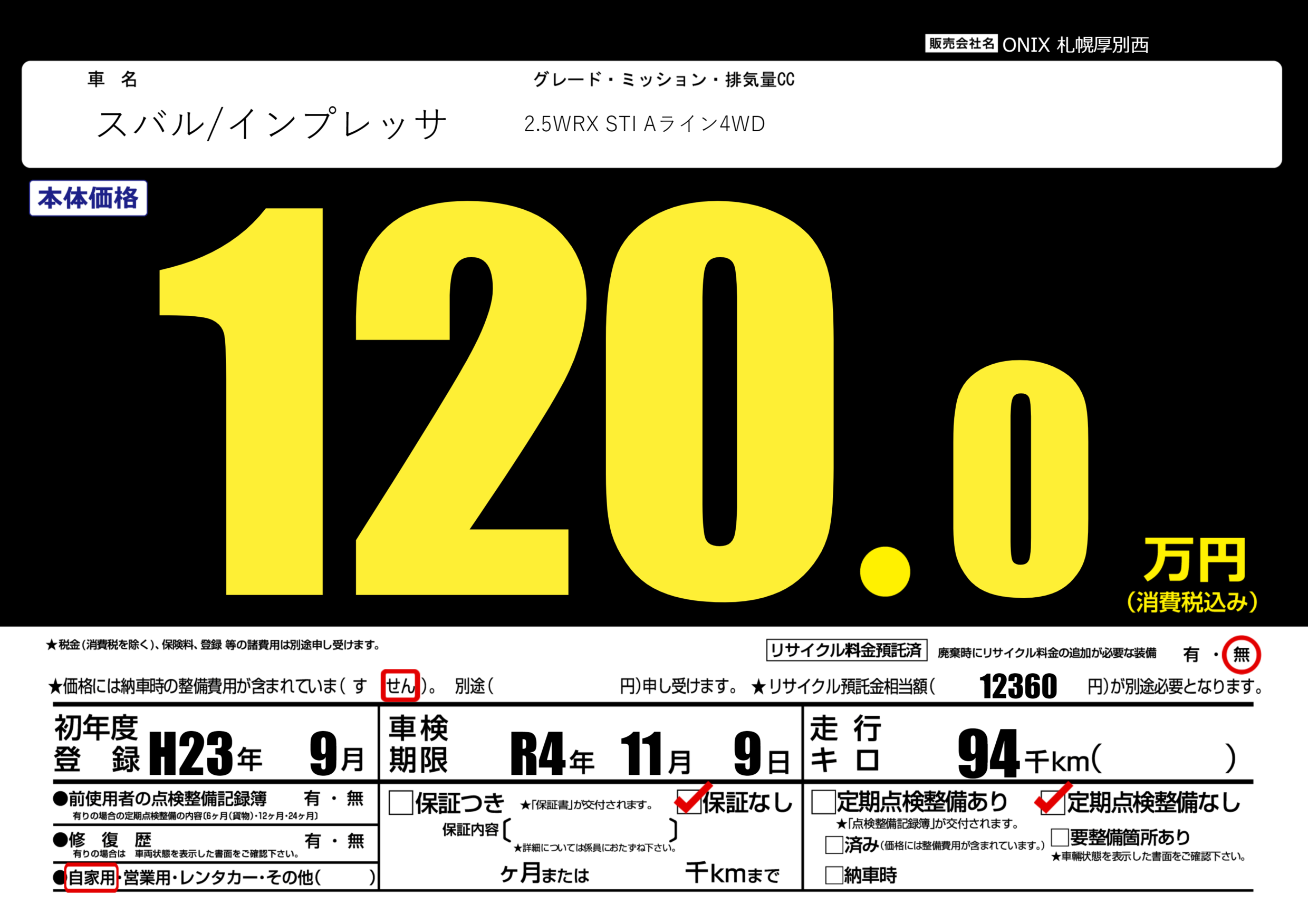 | 車名 | スバル/インプレッサ | グレード ミッション 排気量 |