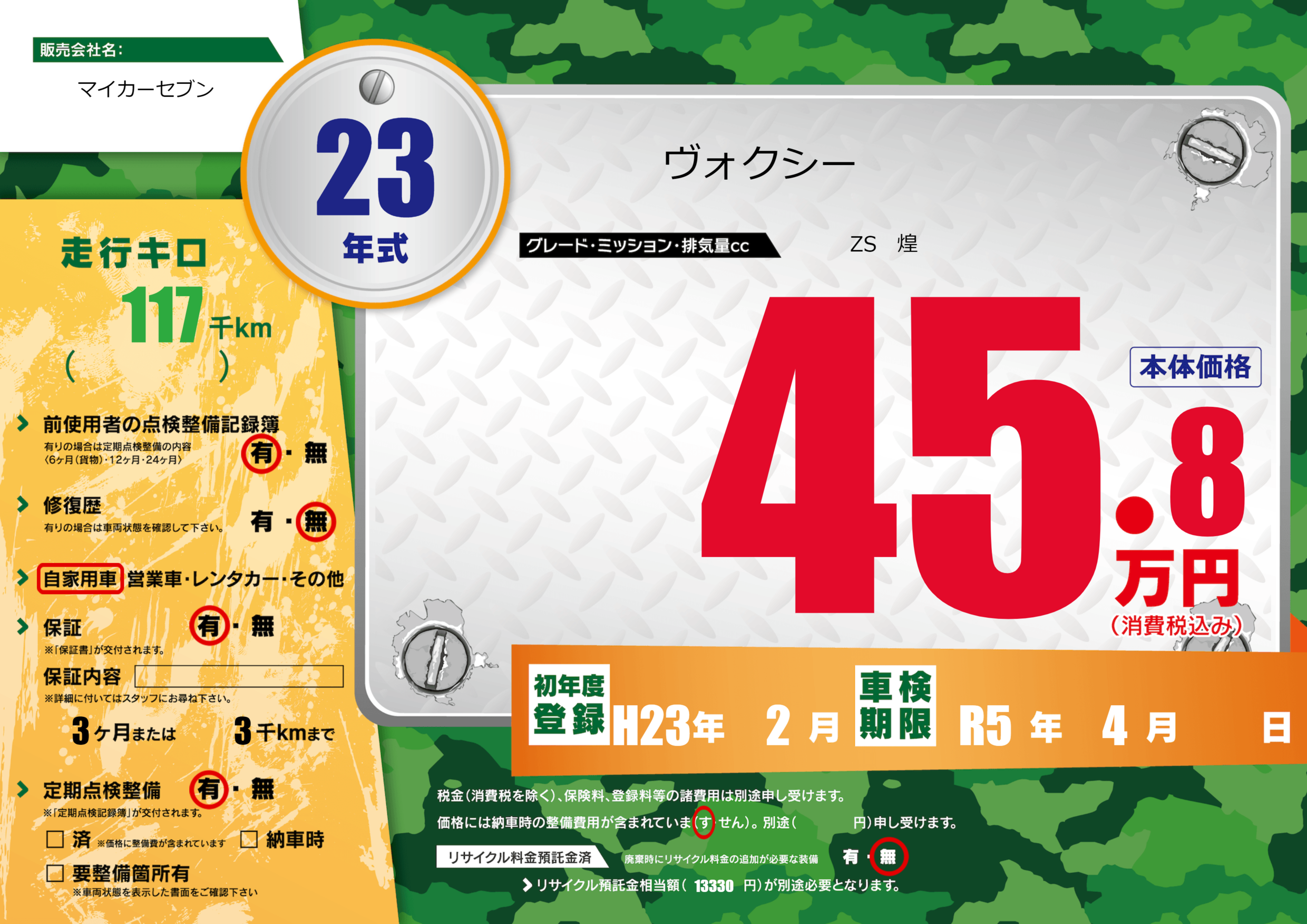 | 走行キロ | 11.7万km | 初年度登録 | H23年2月 |