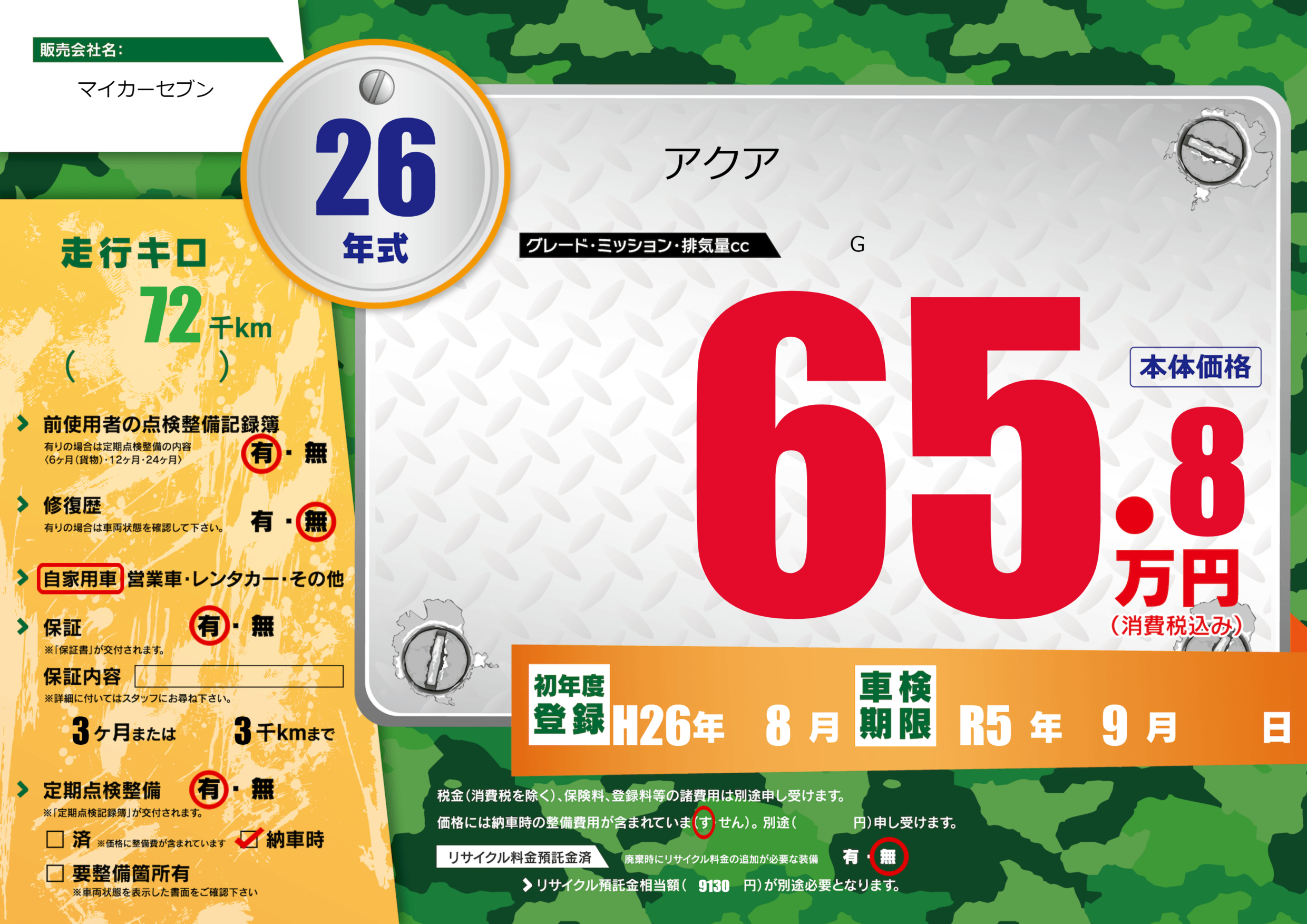 | 走行キロ | 7.2万km | 初年度登録 | H26年8月 |