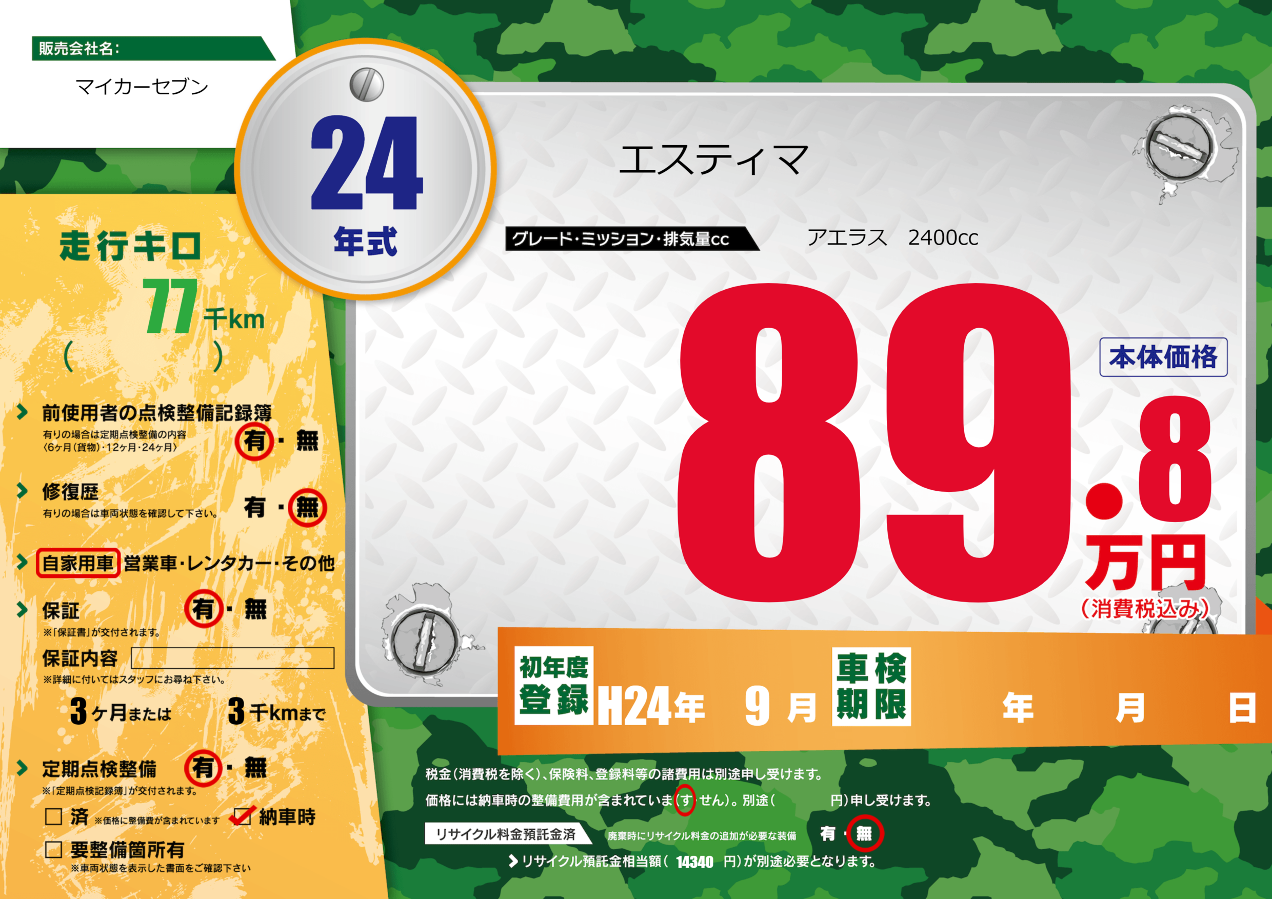 | 走行キロ | 7.7万km | 初年度登録 | H24年9月 |