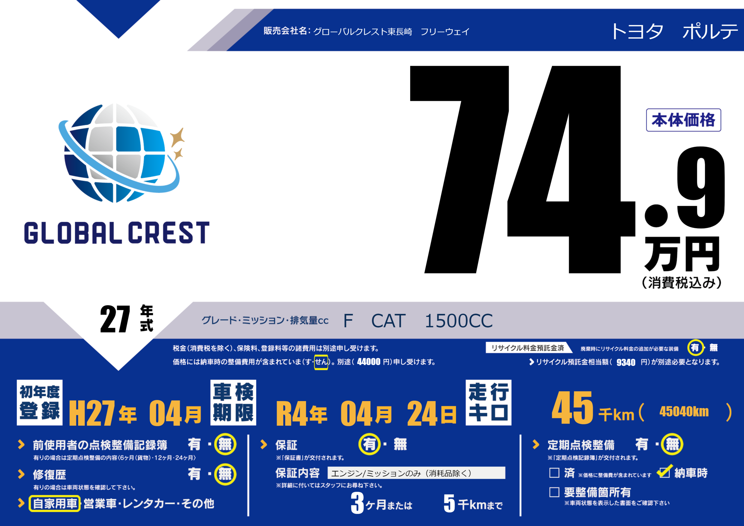 | 車名 | トヨタ ポルテ | グレード ミッション 排気量 |