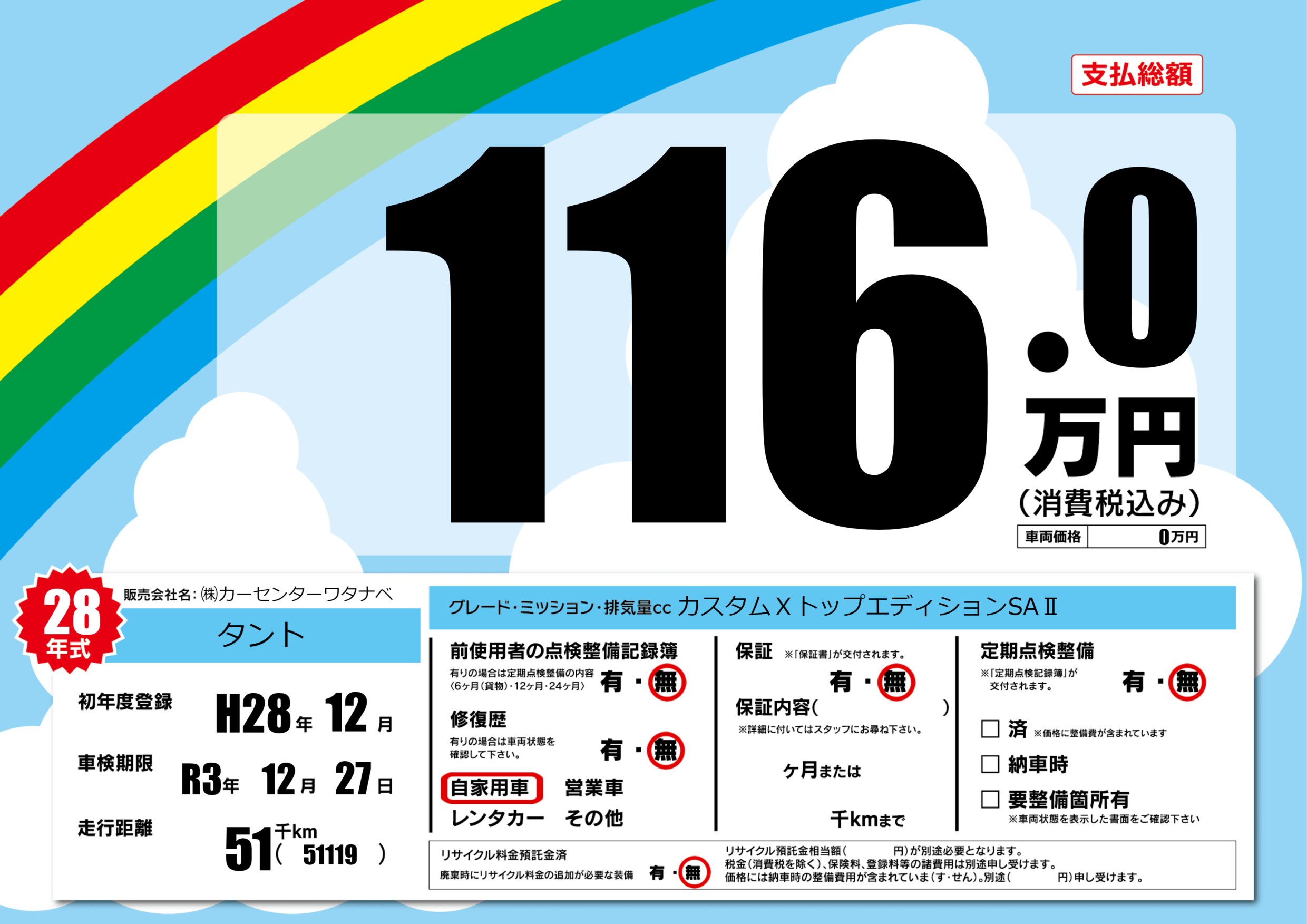 | 走行キロ | 5.1万km | 初年度登録 | H28年12月 |