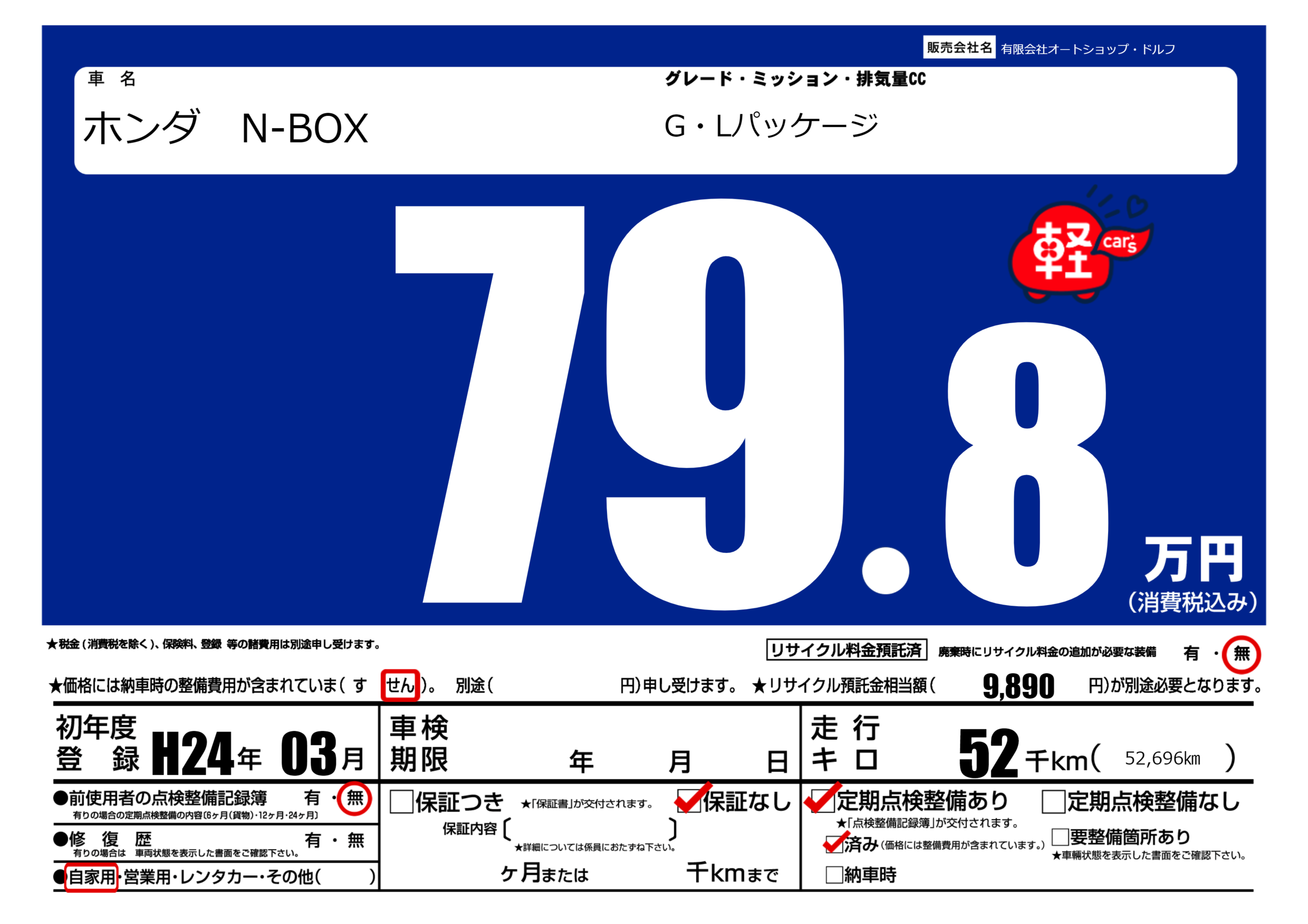| 車名 | ホンダ N-BOX | グレード ミッション 排気量 |