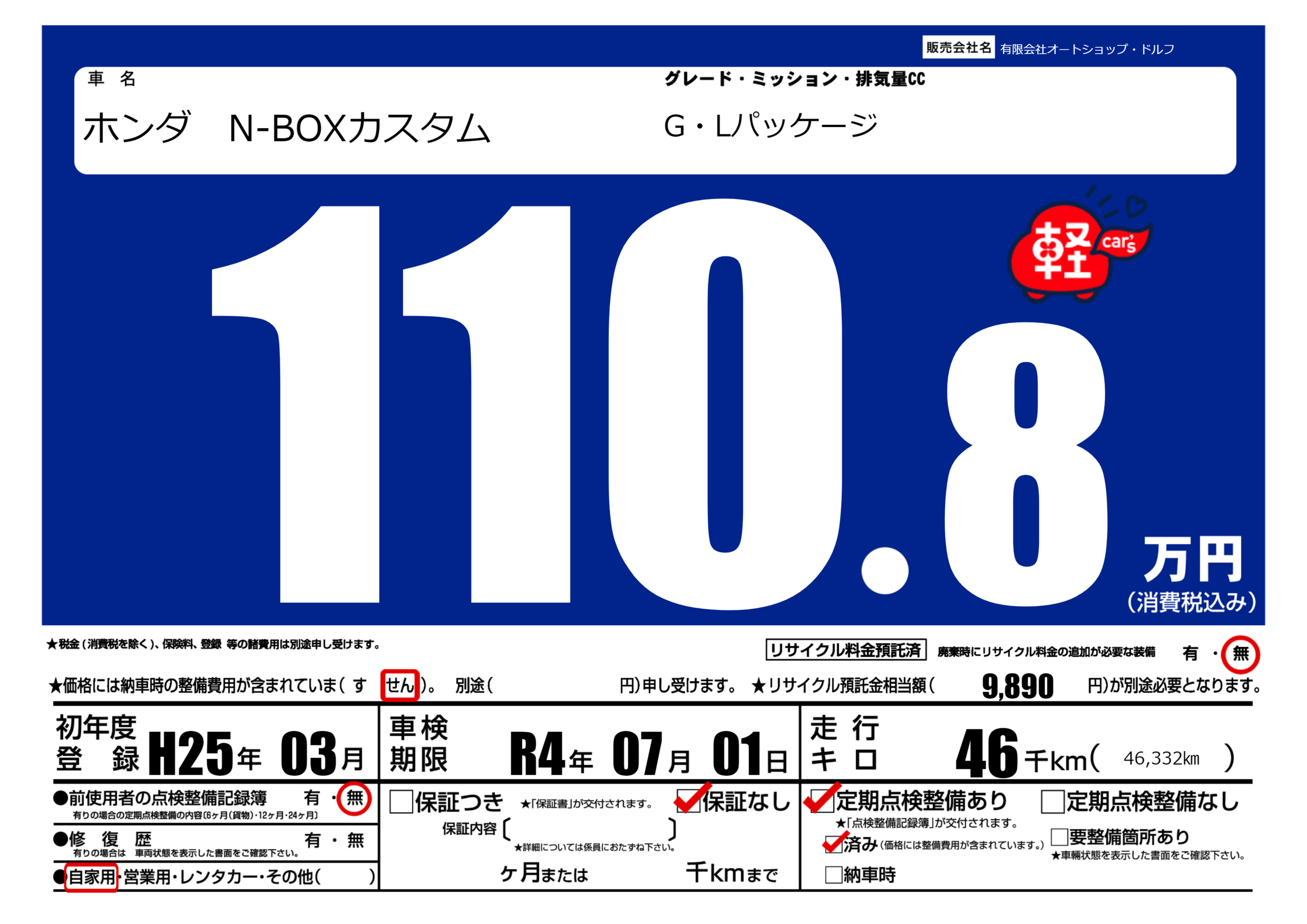 | 車名 | ホンダ N-BOXカスタム | グレード ミッション 排気量 |