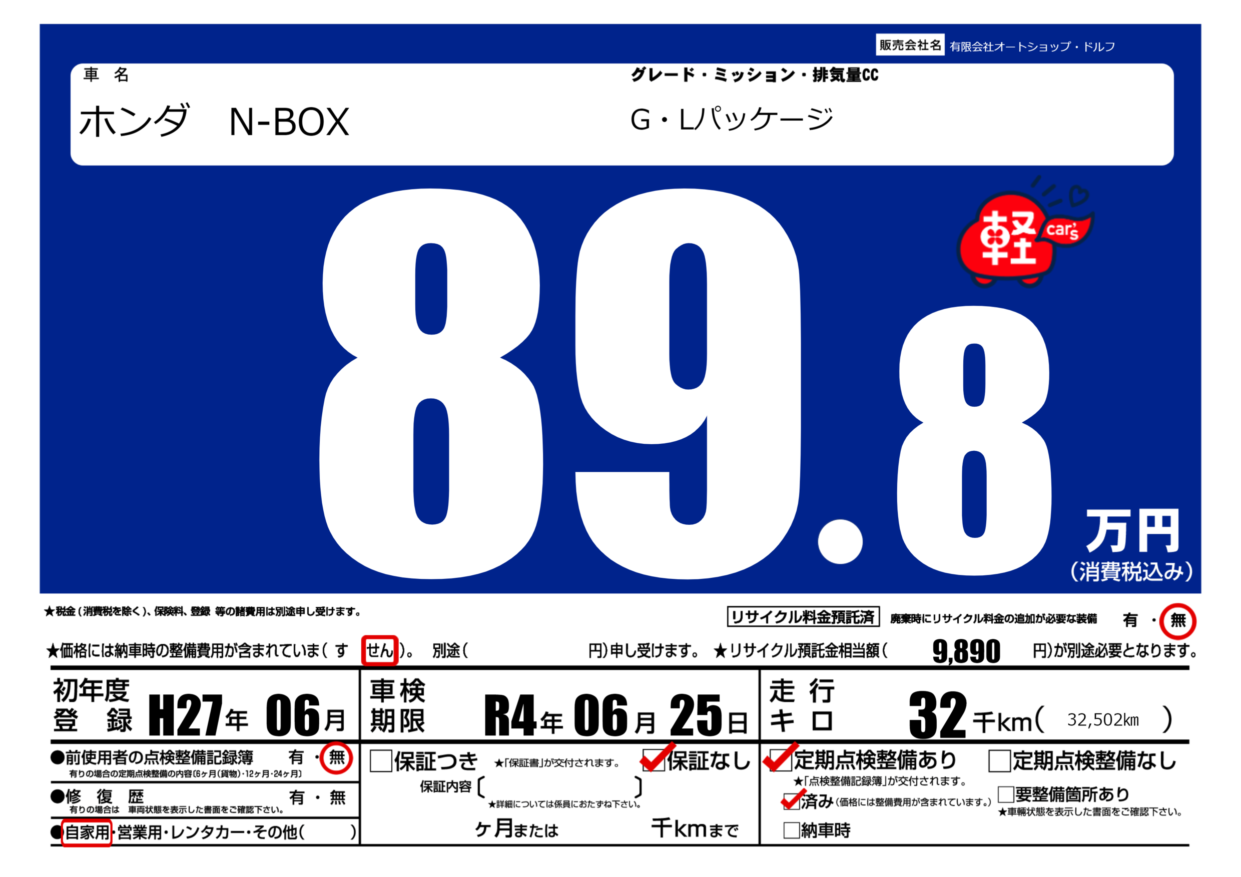 | 車名 | ホンダ N-BOX | グレード ミッション 排気量 |
