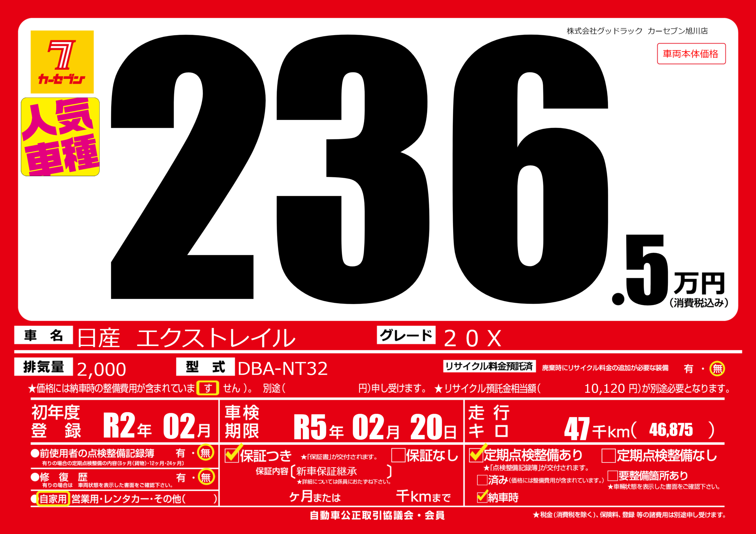 | 走行キロ | 4.7万km | 初年度登録 | R2年02月 |