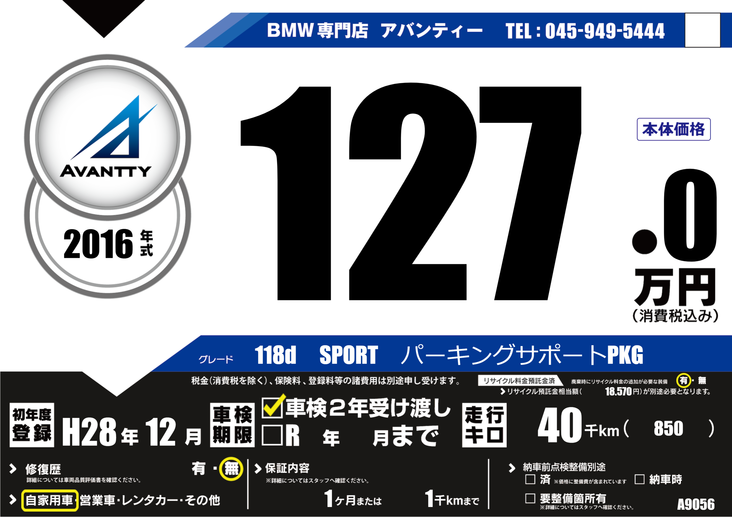 | 走行キロ | 4万km | 初年度登録 | H28年12月 |