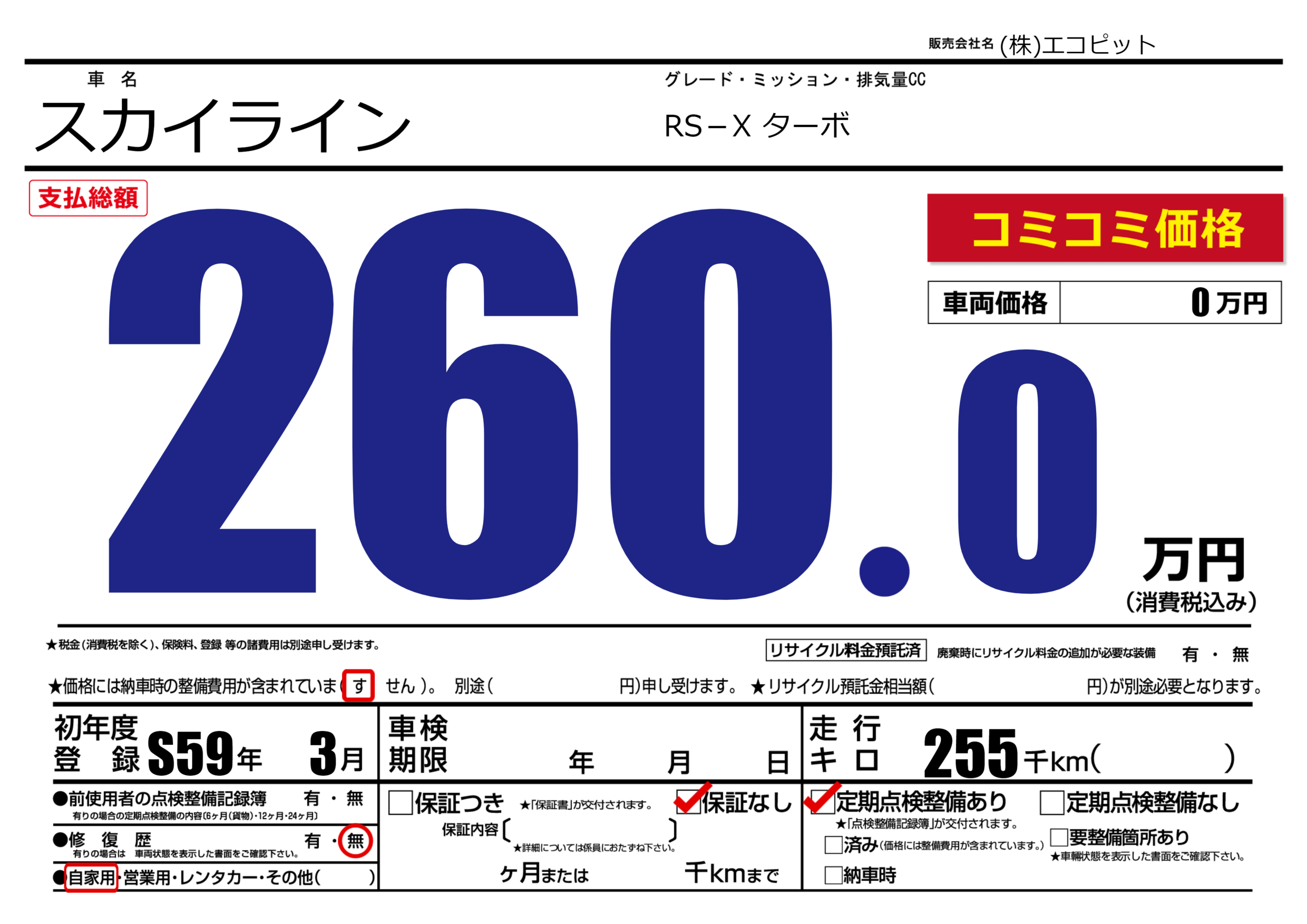 | 車名 | スカイライン | グレード ミッション 排気量 |