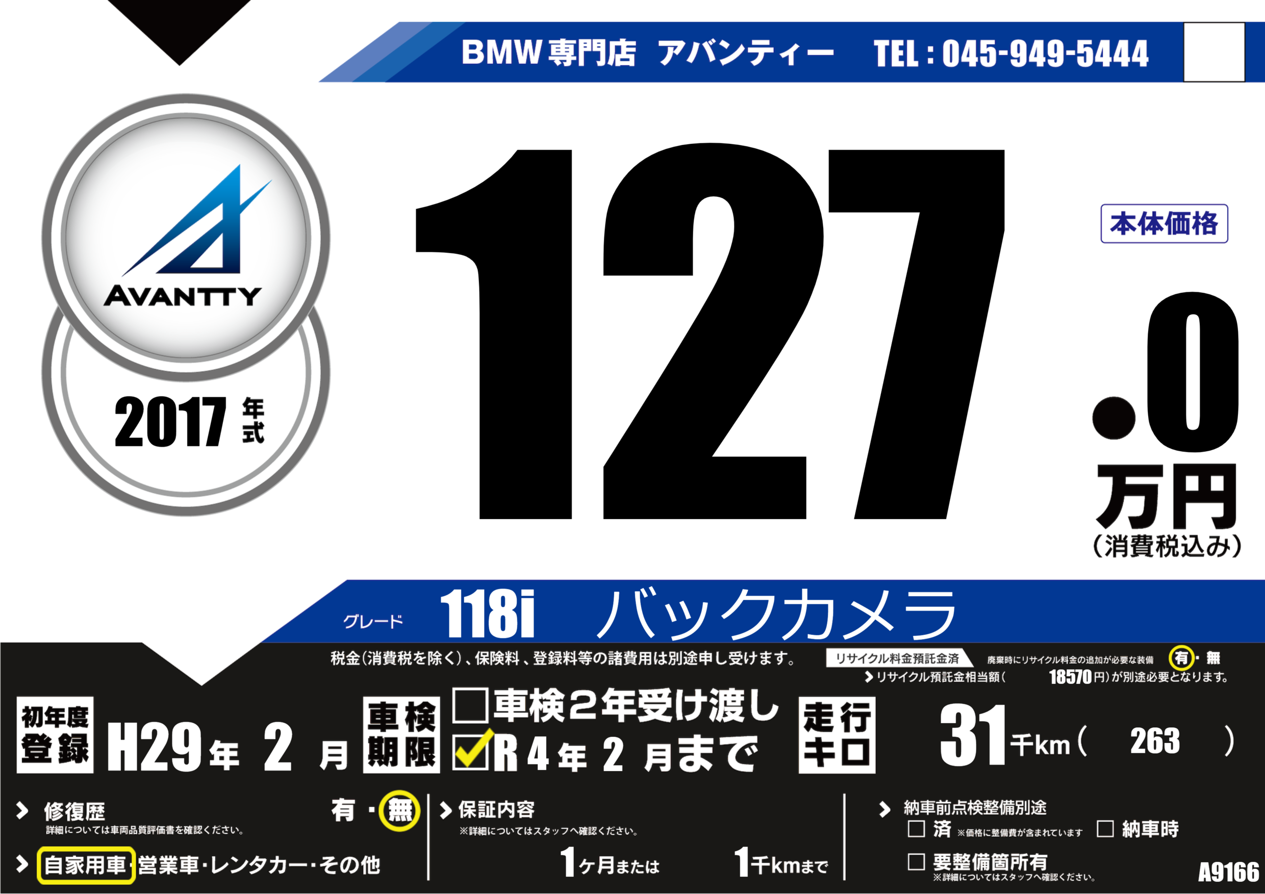 | 走行キロ | 3.1万km | 初年度登録 | H29年2月 |