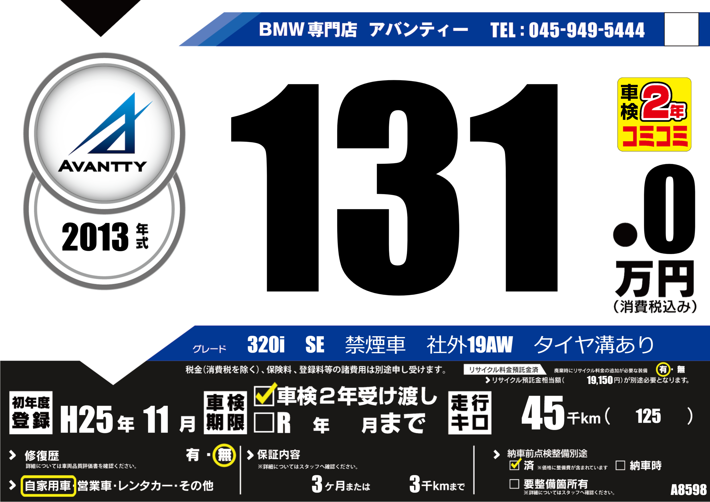 320i SE 禁煙車 社外19AW タイヤ溝あり |