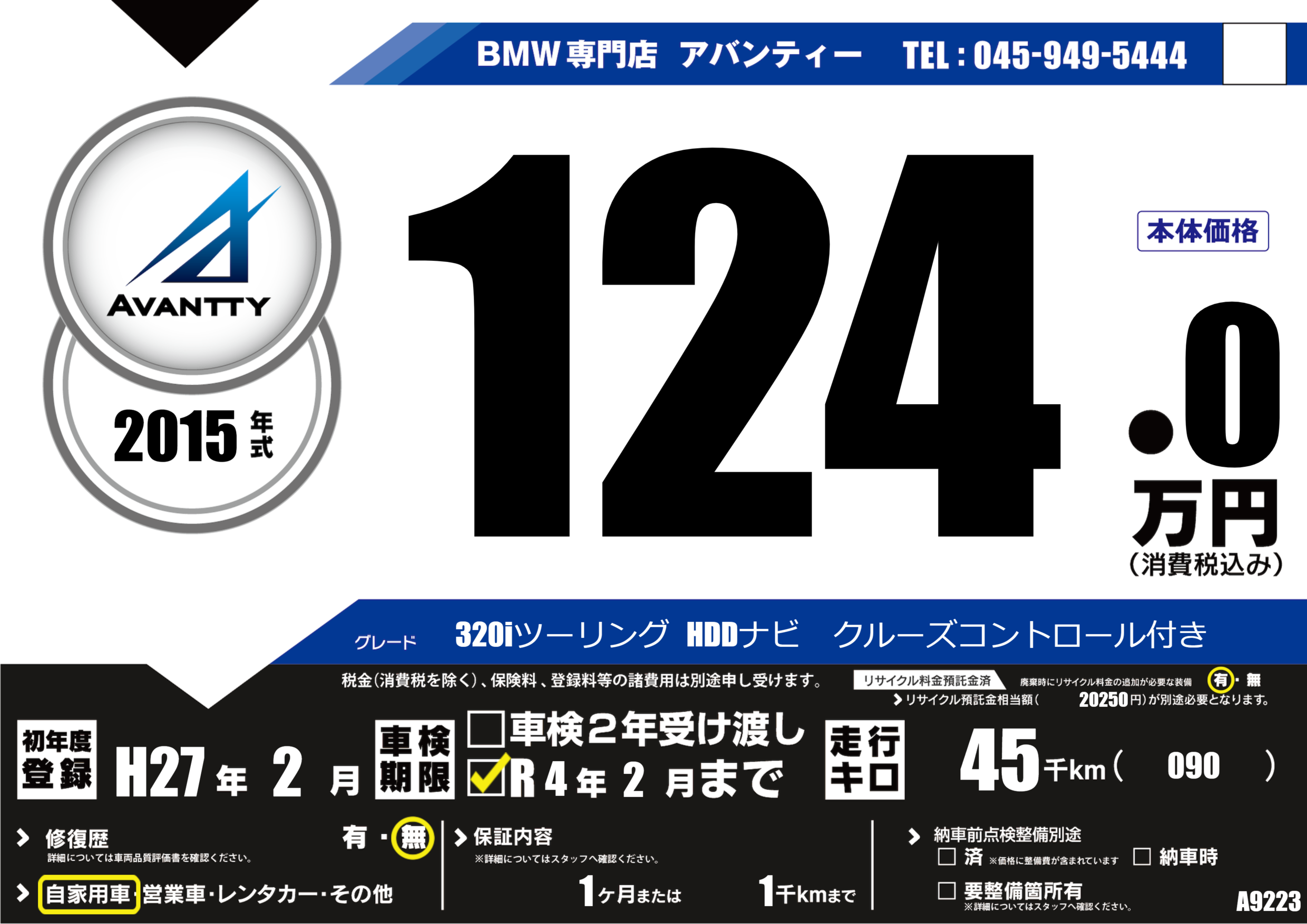 | 走行キロ | 4.5万km | 初年度登録 | H27年2月 |
