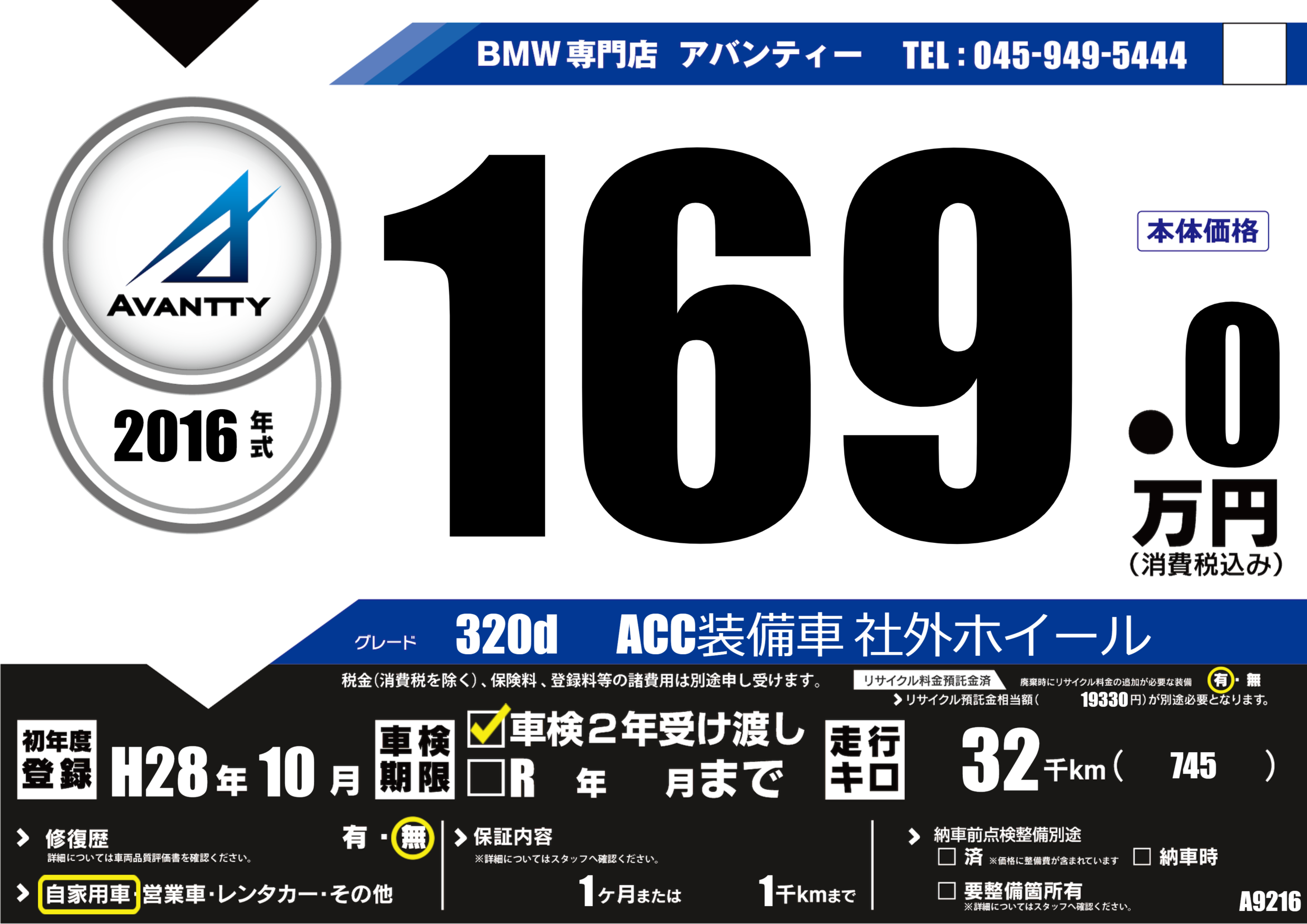 | 走行キロ | 3.2万km | 初年度登録 | H28年10月 |