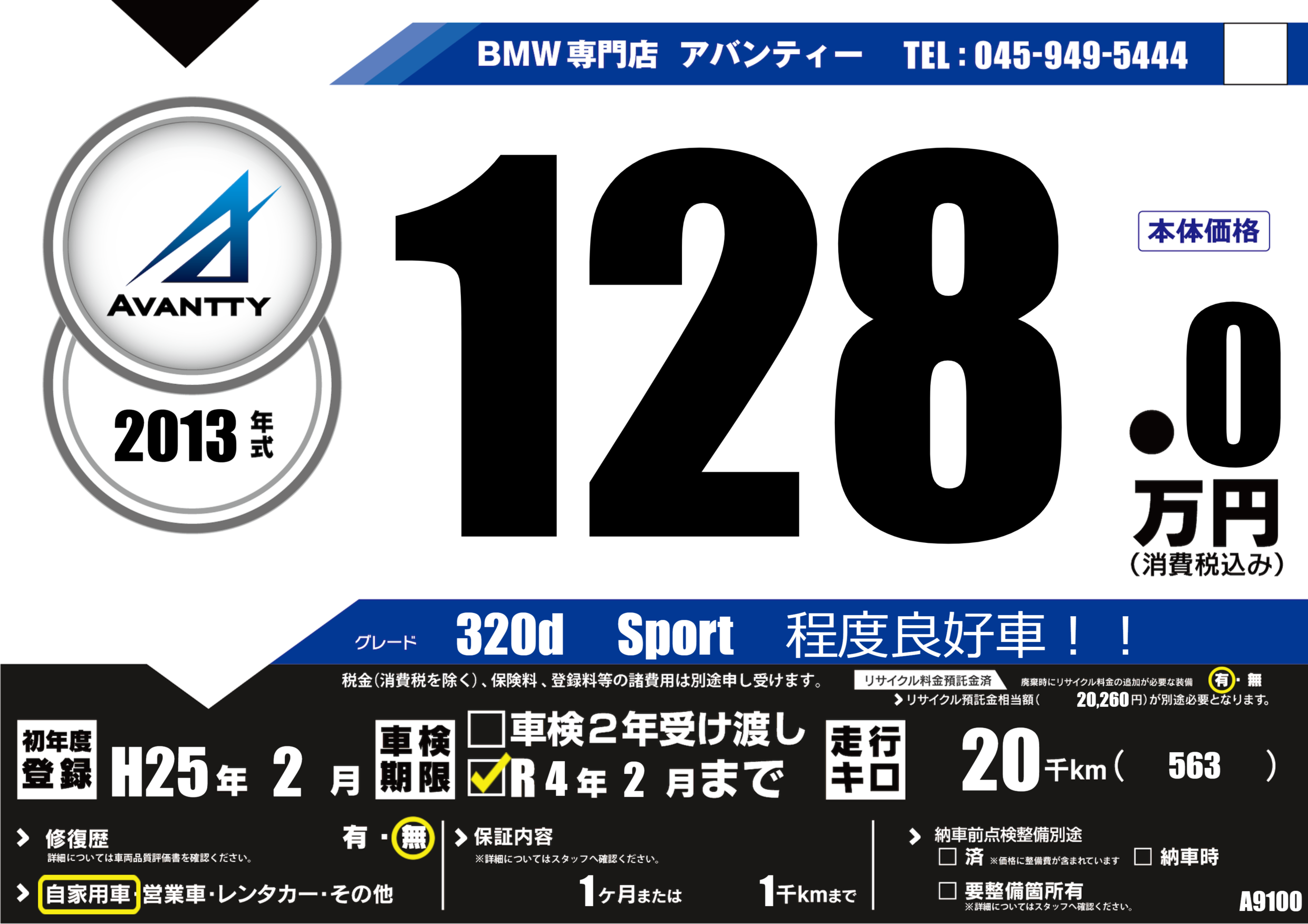 | 走行キロ | 2万km | 初年度登録 | H25年2月 |