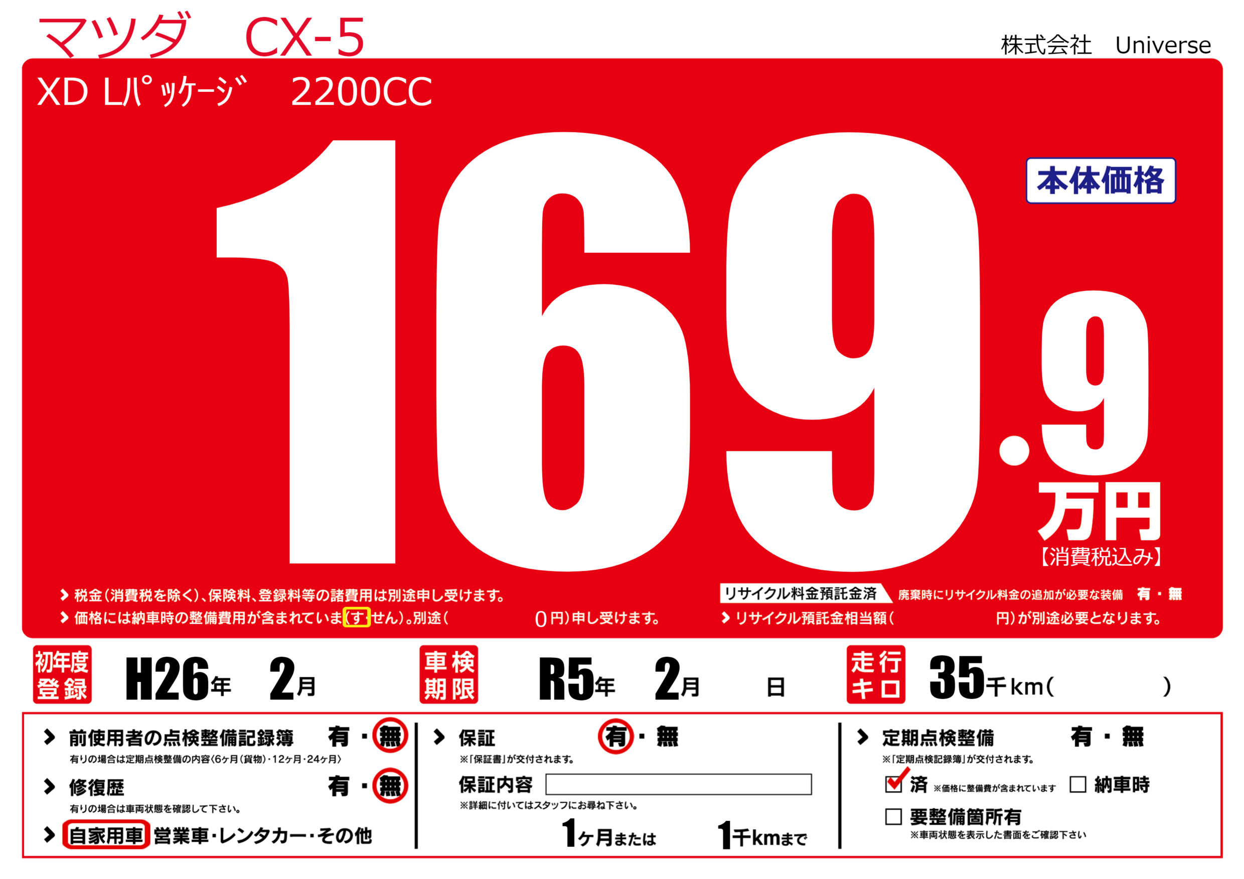 | 定期点検整備 | 定期点検整備済み | ||