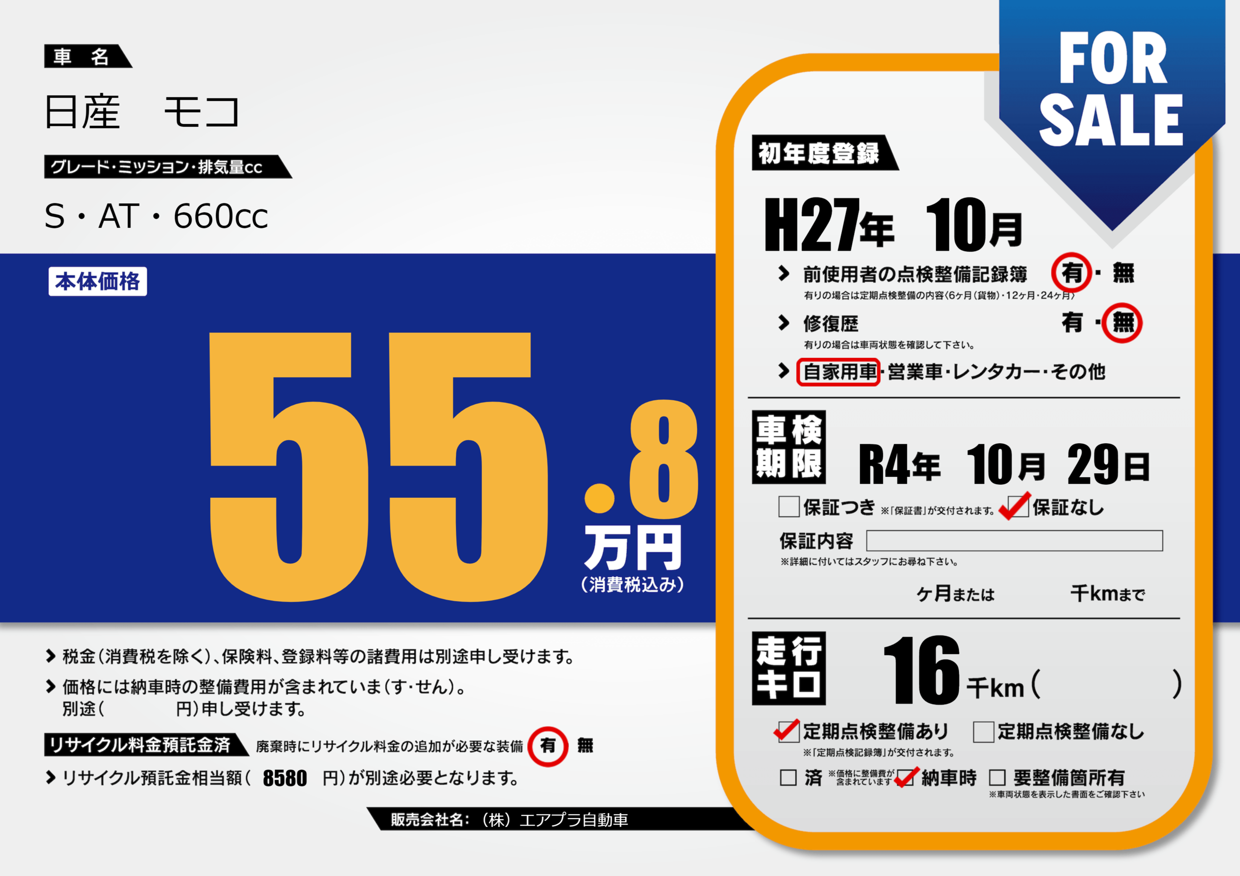 | 車名 | 日産 モコ | グレード ミッション 排気量 |
