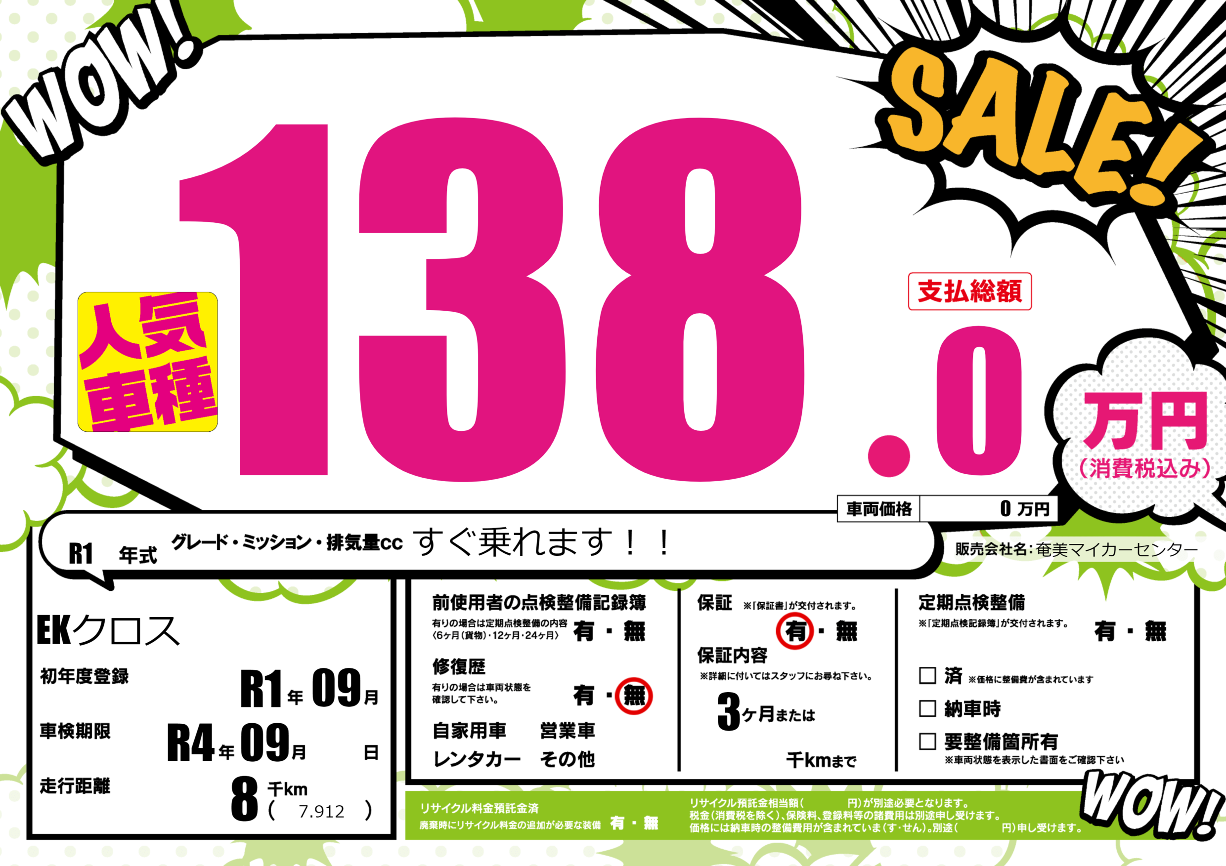 | 走行キロ | 0.8万km | 初年度登録 | R1年09月 |