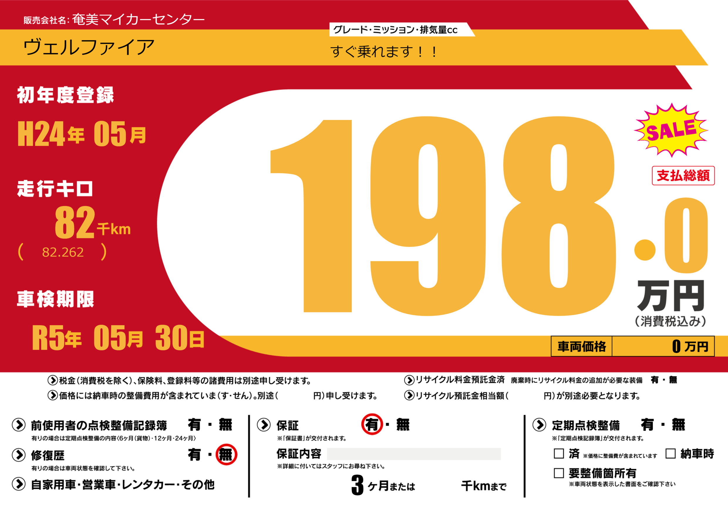 | 車名 | ヴェルファイア | グレード ミッション 排気量 |