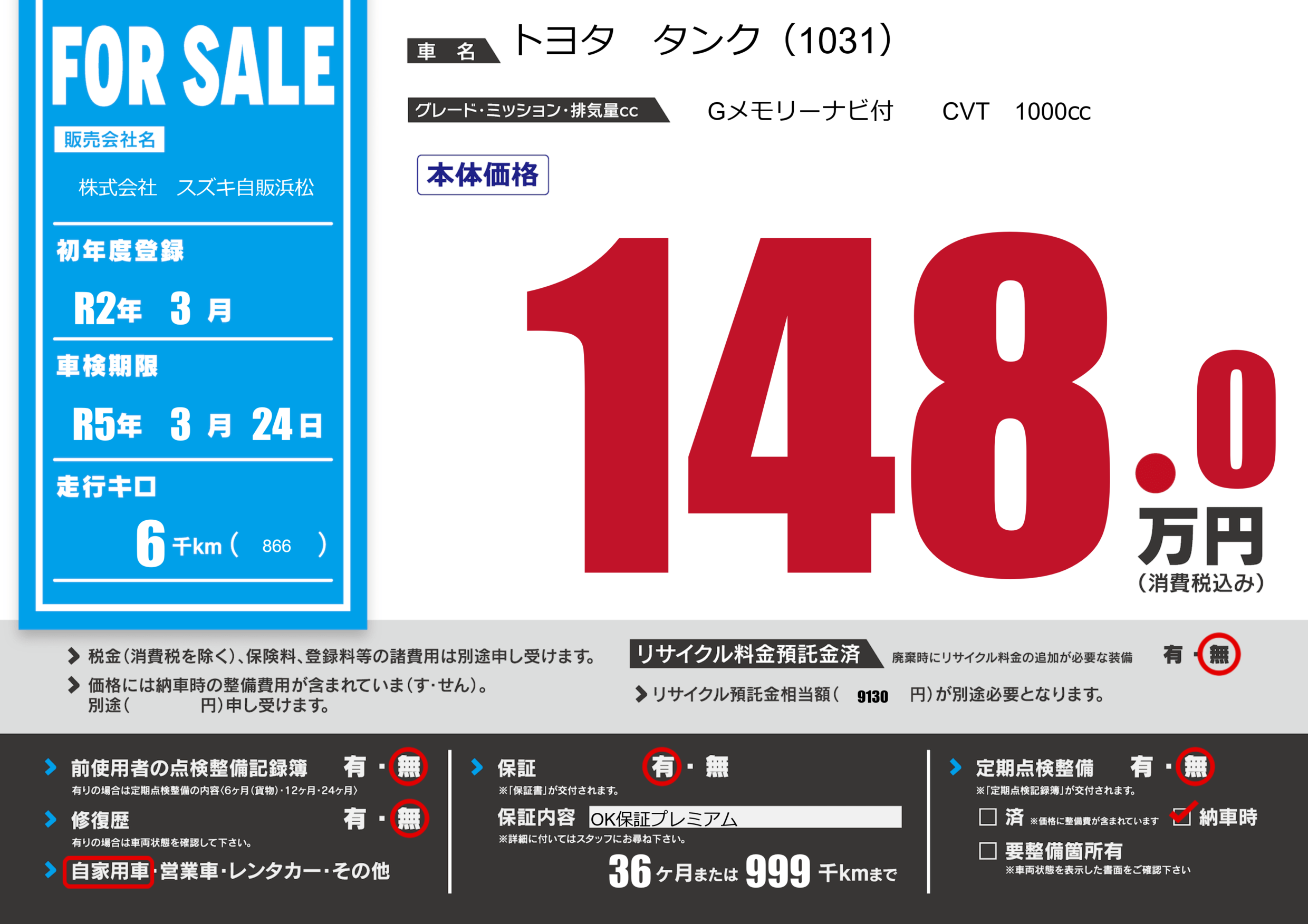 | 車名 | トヨタ タンク(1031) | グレード ミッション 排気量 |