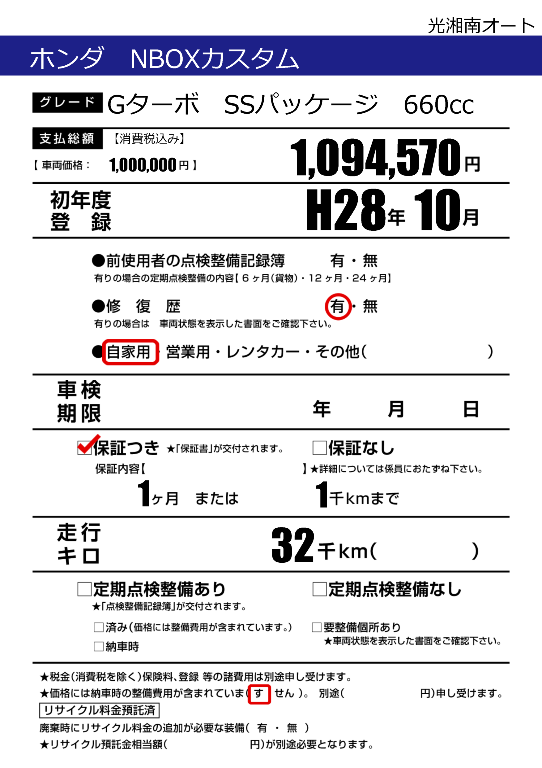 | 車名 | ホンダ NBOXカスタム | グレード ミッション 排気量 |