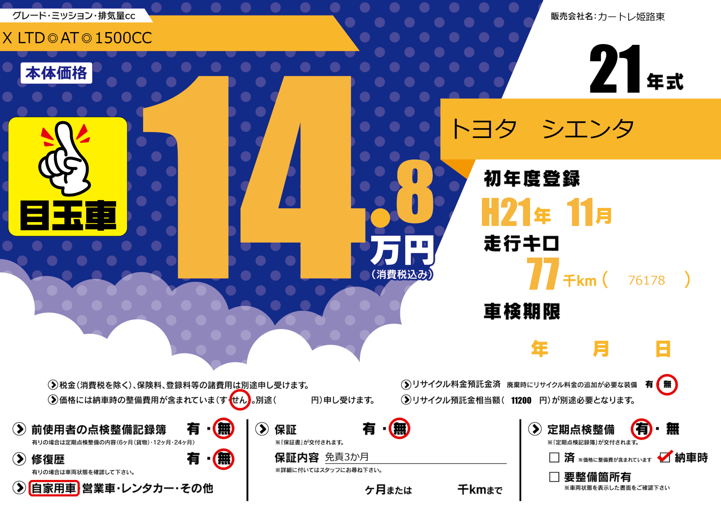 保証なし 保証内容(免責3か月) ---ヶ月または()千kmまで |